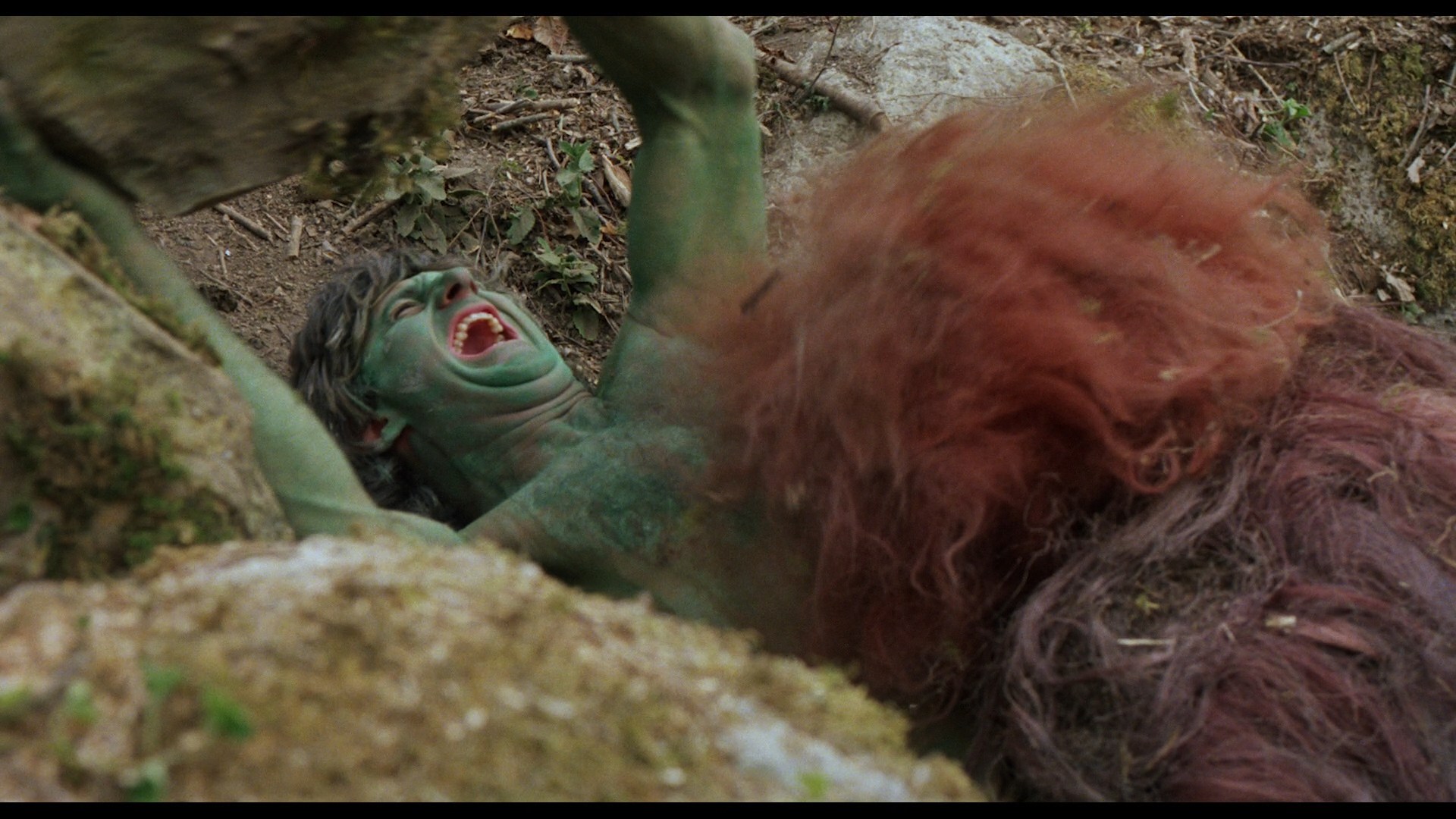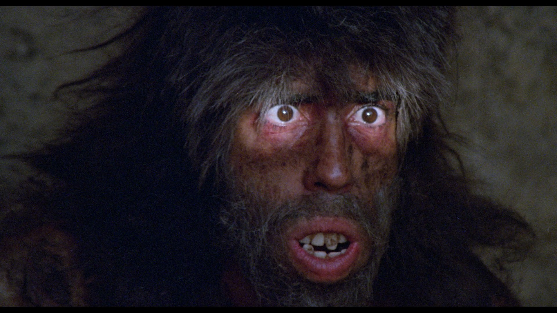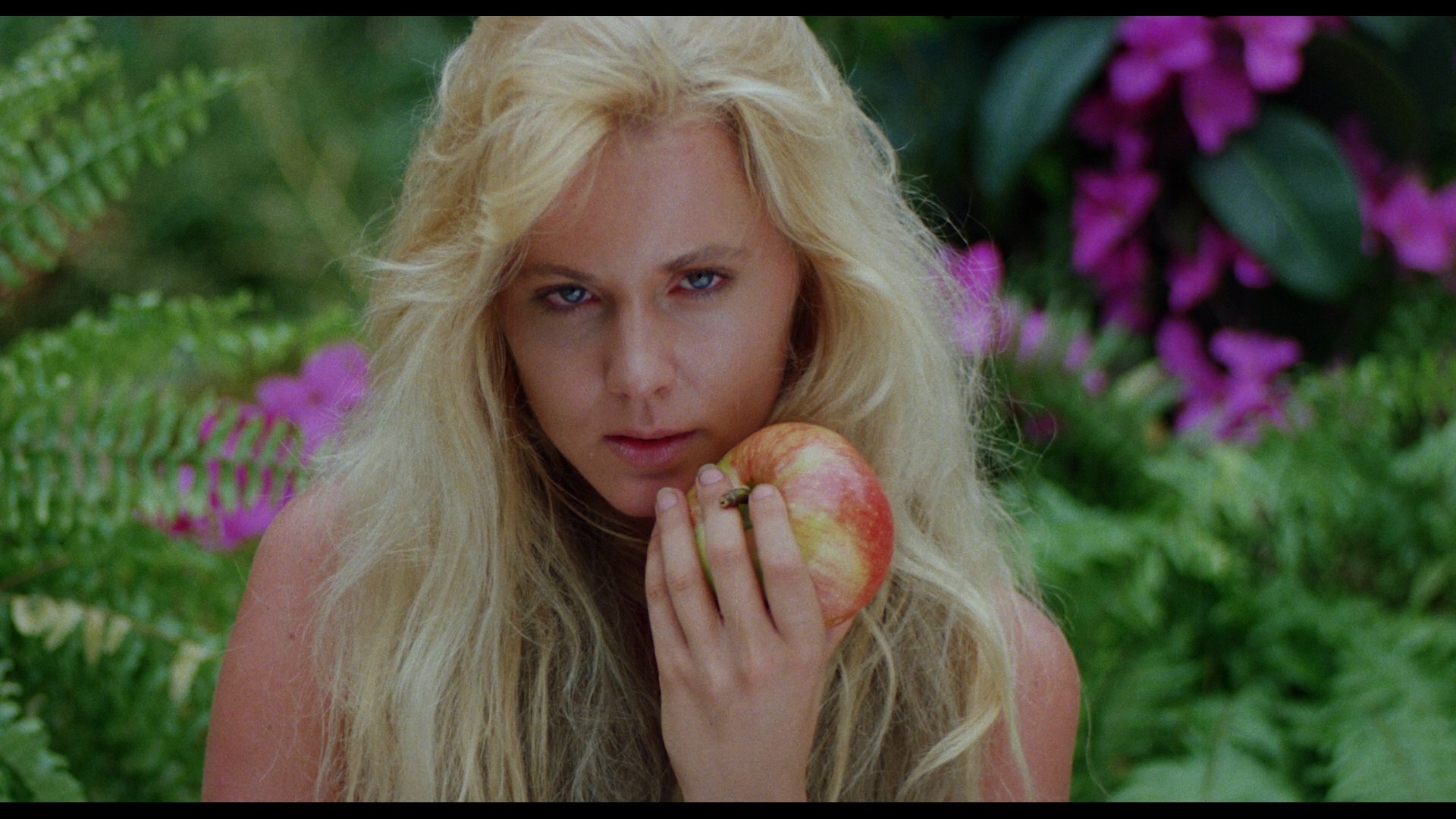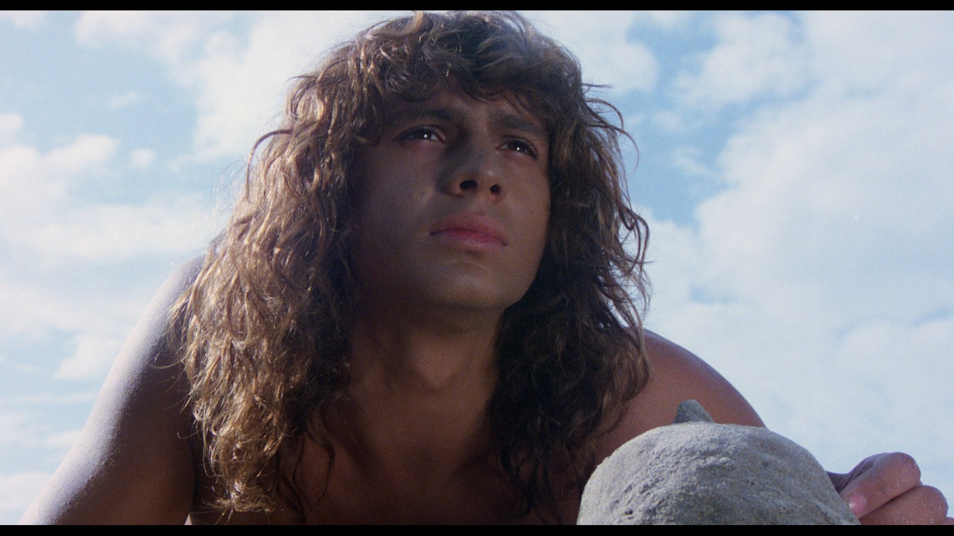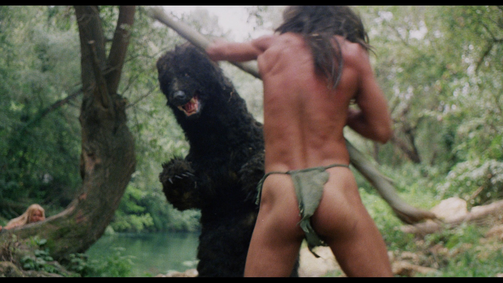 card implies an arduous process of salvaging the very degraded and problematic source material, and whatever devout prayers and technological magic were involved, the results are gorgeous with some minor baked-in damage here and there barely even registering. Extra points for the packaging synopsis which credits this as being from "an original story by God." The film bears a Dolby Stereo credit at the end, but as with other titles like Hell of the Living Dead, there hasn't been anything out there to back that up; in any case, the DTS-HD MA 2.0 mono English and Italian options here both sound very good and come with optional English translated or SDH subtitle options. Either way you'll get an earful of that theme song, "My First Love" sung by Tania Solnik (which gets played about a dozen times), not to mention the "primitive languages created by John Gaiford." Special features include the English theatrical trailer and "Forbidden Cut" (21m21s) with editor Gianfranco Amicucci talking about the decline of Italian cinema as the '80s went along, his gig on this film thanks to The Shark Hunter, the casting of the very polite Gregory (Doria "thought he'd look good in a fig leaf") who had a very sad life after leaving films, the major budgetary constraints, his multiple projects with the De Angelis brothers, and the editing challenges of working with stock footage and DIY special effects.