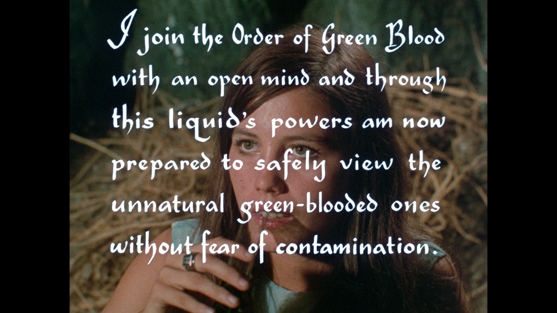 a transfer that was quite good for the time but looks understandably dark, murky and faded by today's standards. The 2018 Severin release is taken from a 4K scan of a fine-grain print at the UCLA Film Archive, and it's a real beauty with superb contrast, fine film grain, and much more clarity in darker scenes. Like the rest of the films in the box, it features a DTS-HD MA English mono track (fine for what it is) with optional English SDH subtitles. The film and its Blood Island successors are available in multiple configurations including standalone Blu-ray or DVD editions (of Terror Is a Man, Mad Doctor of Blood Island, and Brides of Blood) and The Blood Island Collection boxed set exclusively containing Beast of Blood, available by itself or as part of The Blood Oath Bundle (with an enamel pin, Beast of Blood swizzle stick and coasters, Blood Island treasure map, and Blood Oath recipe card). An extravagant Dr. Lorca's Head Bundle was also released but limited to 45 units. Culled from a session for Mark Hartley's Machete Maidens Unleashed, "Man Becomes Creature" (5m50s) with Hemisphere marketing consultant Samuel M. Sherman covers his entry into the company while working at Famous Monsters of Filmland and explains the genesis of this whole "blood' title thing. "Dawn of Blood Island" (5m12s) with Romero is a brief recollection of his admiration for de Leon's work process and his own lack of thought put into his target audience, while "Terror Creature" (2m23s) with Immoral Tales co-author Pete Tombs lays out this film's importance in the international horror scene and "When the Bell Rings" (2m15s) with critic Mark Holcomb lauds the film's often overlooked subtlety and clever uncredited