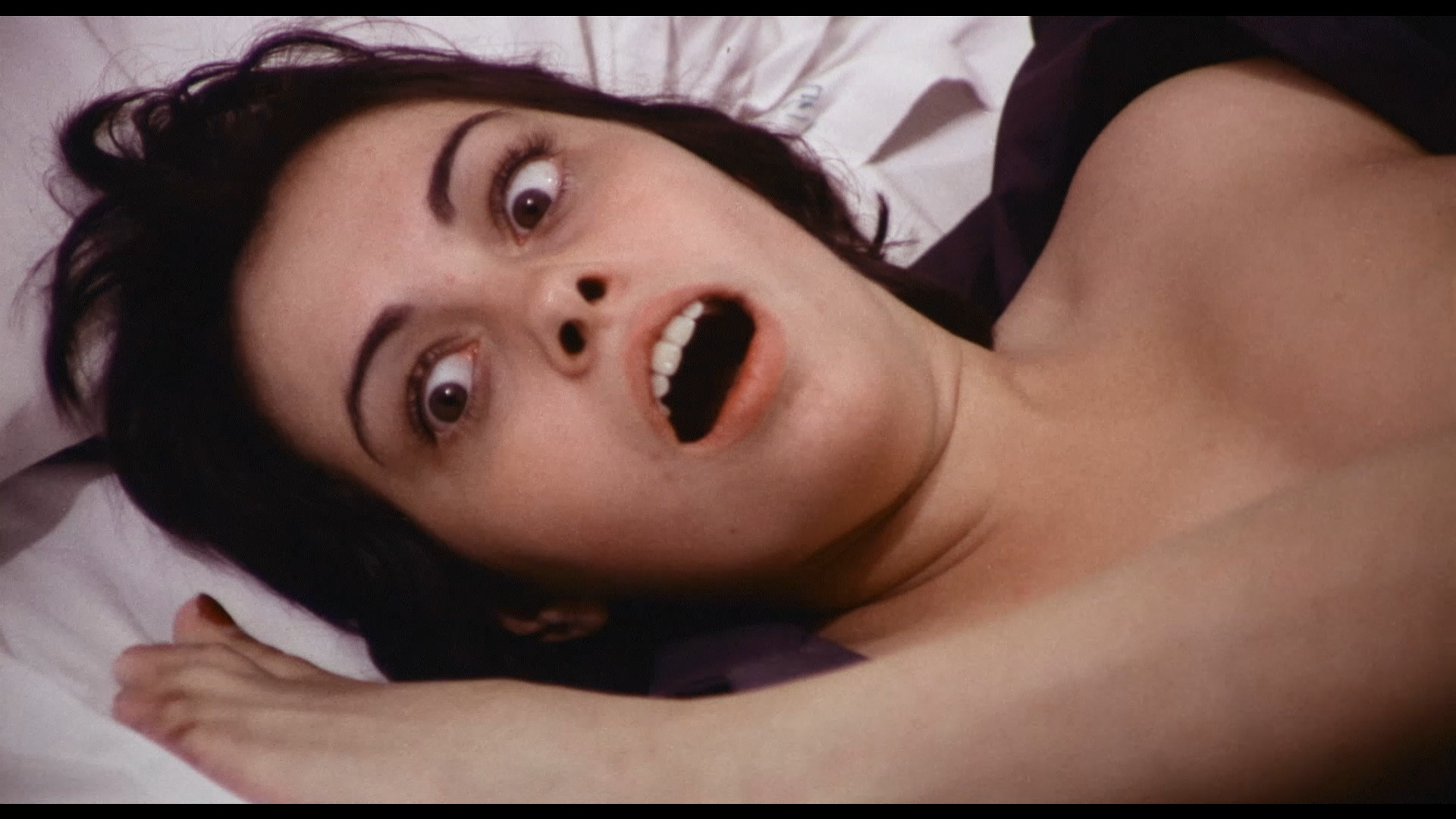 Here the fixation on Romay's uninhibited screen presence really takes advantage of her ability to display sexual mania even more than before by casting her in two roles, the jaded Lady Doriana Gray who wanders her estate and can't feel sexual satisfaction regardless of her partners, and her twin sister in a mental institution who lives in a constant state of orgasmic mania. On top of that, echoing her previous iconic Irina role for Franco, Doriana's lovers all die at the height of passion, a fate that could befall men or women including a reporter (Franco regular Swinn) who comes for an interview session or Doriana's servant (Hardy a.k.a. Ramon Ardid, Romay's husband at the time) and his girlfriend (Stedil).