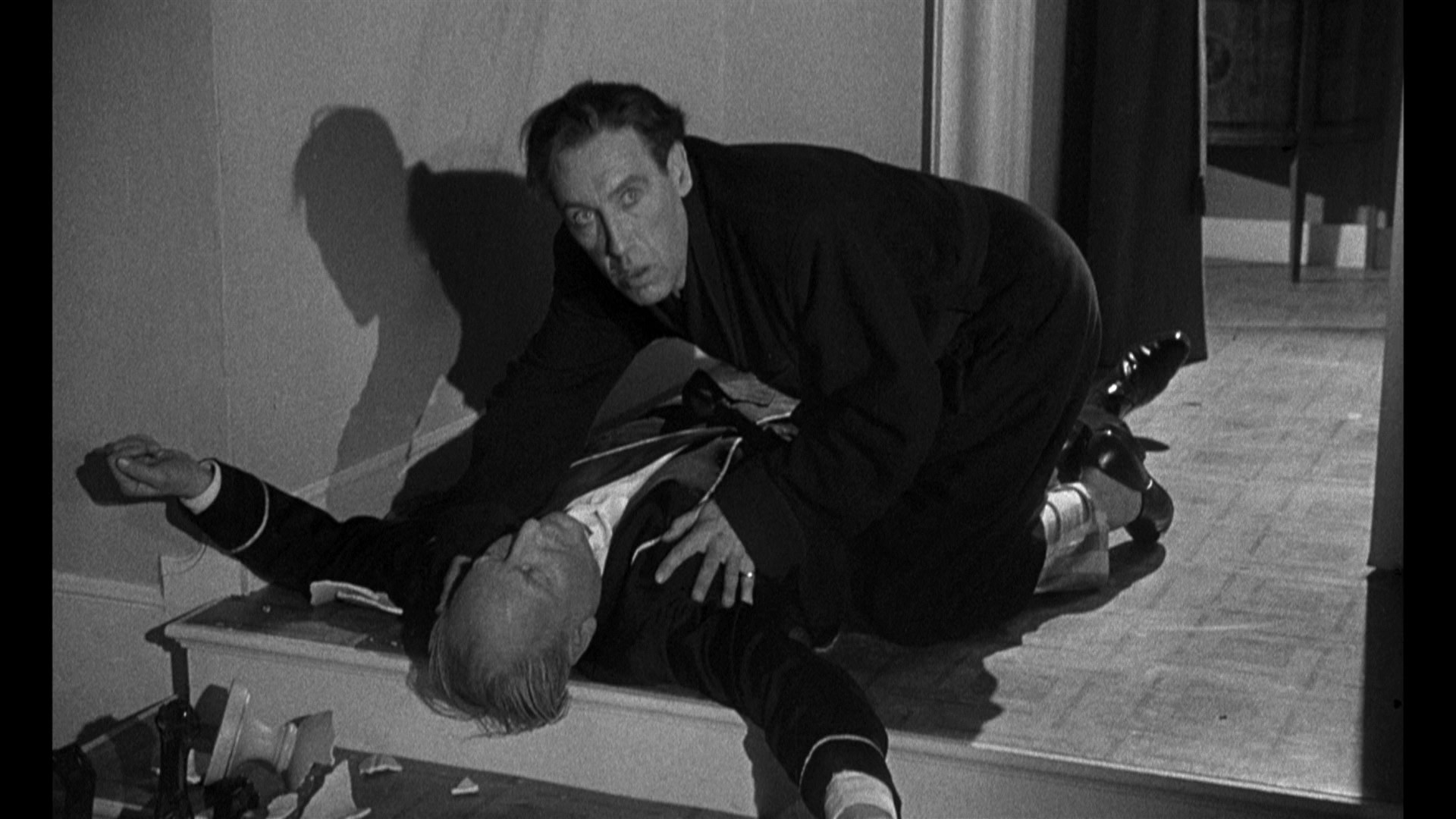 Finally the set closes out on disc six with Fortune Is a Woman, also released in the U.S. as She Played with Fire (with an option to view it with either main title sequence). It's the latter title that was used for the film's prior release on American Blu-ray, presented on a disc with The Tijuana Story and The Case Against Brooklyn as part of that Mill Creek and Kit Parker Noir Archive Volume 3 set. Directed by the venerable Sidney Gilliat, it's one of the best films in the set and a great way to wrap things up on a high note. When a fire breaks out at a country estate, insurance investigator Oliver Branwell (Hawkins) discovers that the lady of the house, Sarah (Dahl again), is a former girlfriend who's now married to the wealthy Tracey Moreton (Price). That's just the beginning though as he learns that the art collection claimed in the fire probably consisted of forgeries, triggering a string of revelations and quite a bit of mortal danger.