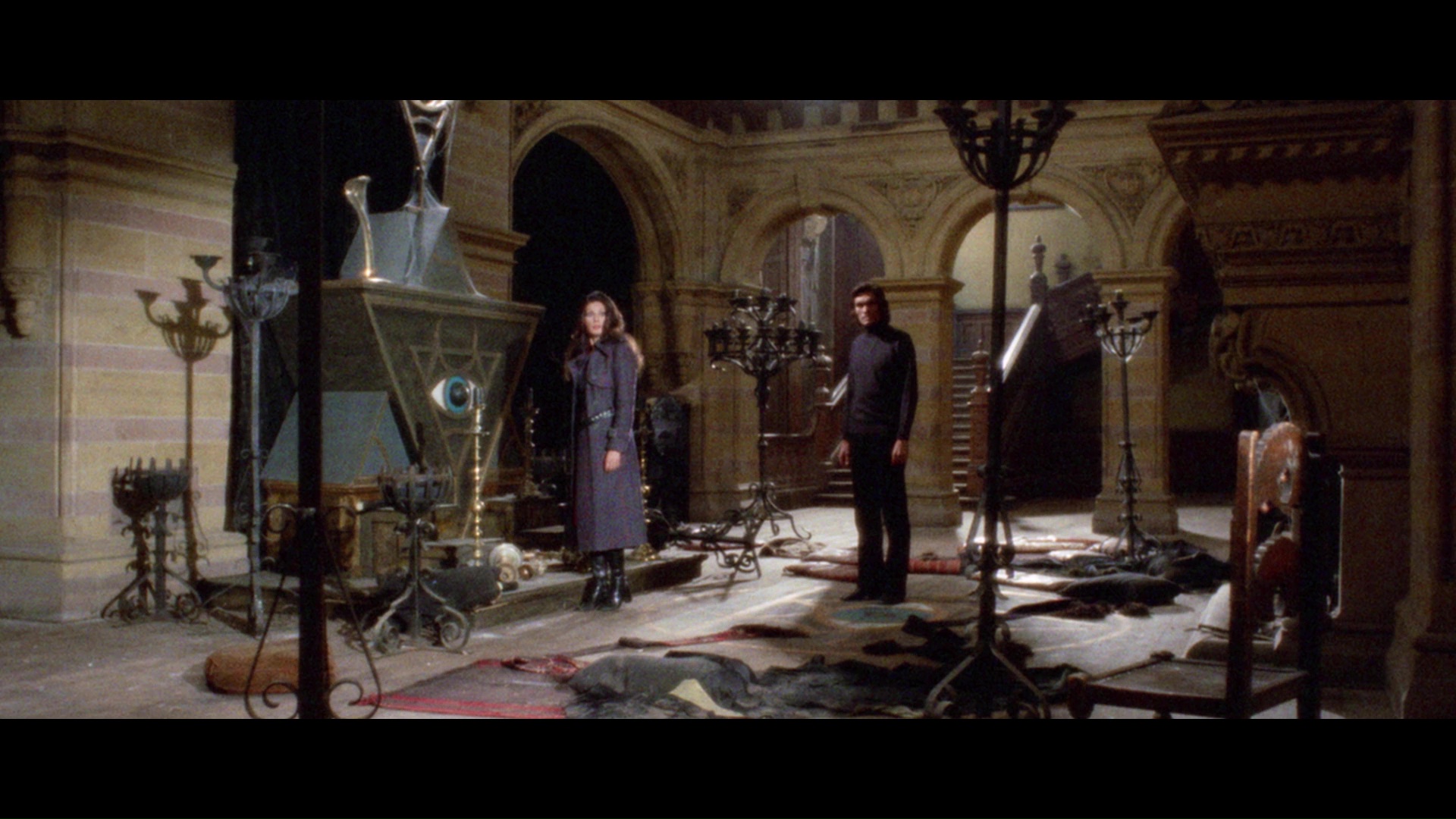 Here the glamorous duo appear as Jane and shrink hater Richard, a posh London couple coping with the stress of Jane's recent miscarriage due to a car accident. Meanwhile Jane has also been having intense, recurring nightmares involving the murder of her mother and a blue-eyed, knife-wielding Ivan Rassimov, so she seeks help from her sister's psychiatrist, Dr. Burton (Rigaud). Jane's mysterious new neighbor, Mary (Malfatti), has a far more radical solution in mind; she initiates Jane into a satanic cult! Here the main devil worshiper (Ugarte), a goateed creep with long gold fingernails, forces Jane to drink fox's blood from a golden goblet and tosses her on the floor for a druggy orgy scene. As Jane's sanity begins to crumble, she wonders whether her horrific visions might actually be premonitions of a violent future; even worse, it could be connected to a sinister man who seems intent on terrorizing and stalking her no matter where she goes.