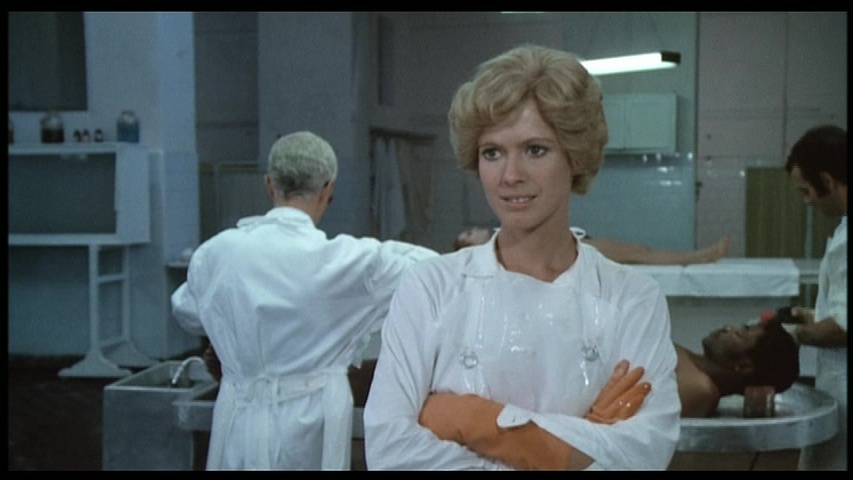 for the camera, and even having sex on the morgue floor! Simona's piggish boyfriend, Ed (Lovelock, still sporting his beard from The Living Dead at Manchester Morgue), is peeved when her visions interfere with their sex life. One day a gunshot suicide victim found on the beach is wheeled in, and Simona recognizes the victim as a beautiful woman she had seen earlier. The brother of the deceased, a slightly dubious priest (Primus), believes the woman's death was actually murder, and Simona's research indicates he may be correct.