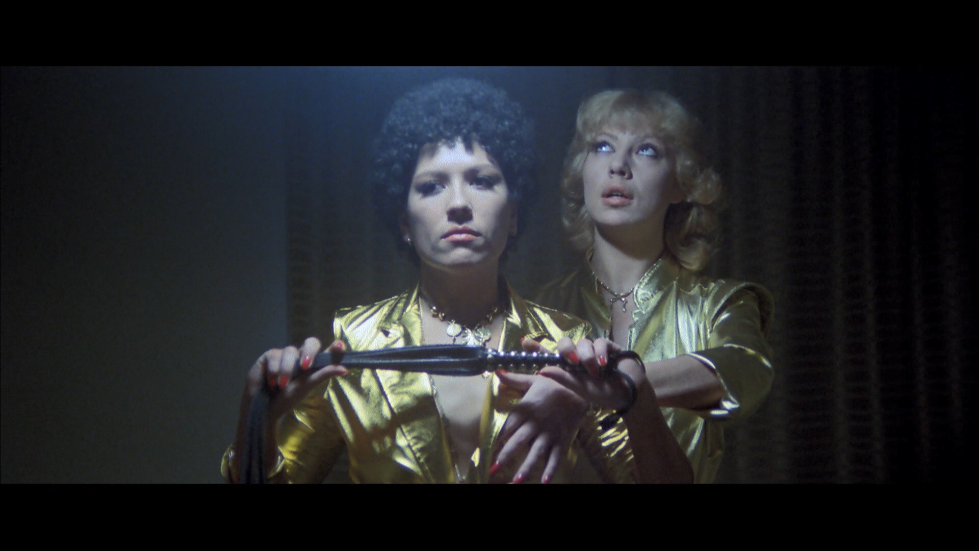 Despite the title, this one limits its leather kink to one sequence -- but it sure makes it count right in the middle of the film, as Al falls afoul of a dominatrix and her gold lamé-loving cohorts that ends up with our antihero getting stripped naked and furiously whipped while highly inappropriate self-gratifying use is made of a cane. Overall though this is really Franco in crime movie mode all the way complete with Romay scorching it up as a great femme fatale and Mayans doing his patented gumshoe routine, this time appearing both with and