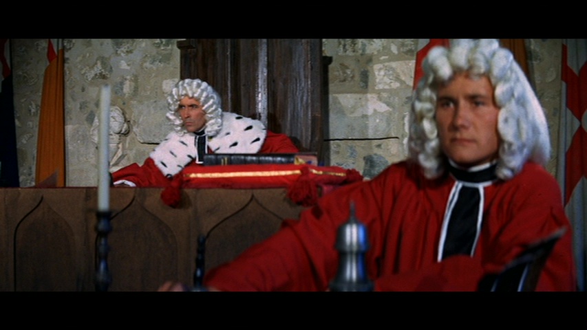figure as a man so firm in his beliefs and warped principles that he doesn’t comprehend the full damage being inflicted by his gavel. Unfortunately this treatment also makes him a less menacing and compelling figure, despite Lee’s usual commanding performance (mostly confined to sitting behind benches and desks). Otherwise the story is pretty much the same as Reeves’, with a young couple (Rohm and German actor Hans Hass Jr.) torn apart by the misguided religious persecutions inflicted by blind justice. The Bloody Judge also bears a resemblance at times to another Franco/Towers production, Justine, by playing like a costume melodrama punctuated with an odd nasty torture scene that seems to have strayed in from a different movie.