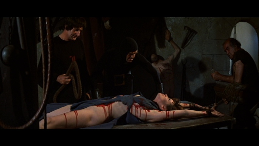 The first DVD out of the gate from Redemption sublabel Salvation in the U.K. in 2000 was notable for containing one fairly strong, bloody sequence with Alicia’s barely covered body being tortured on the rack by Franco stalwart Howard Vernon (in a very funny costume), but otherwise there was precious little violence or sex in this so-so, non-anamorphic letterboxed release clocking in at 89 minutes. The German edition, The Witchhunter of Blackmoor (Der Hexentöter von Blackmoor), featured many additional topless and torture scenes (primarily with Ms. Rohm), and this footage was incorporated into the English version for Blue Underground’s much