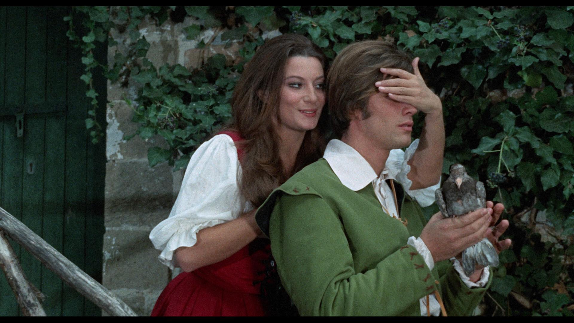 The Severin release devotes no less than three discs to the film, which absolutely deserves such a prestigious tribute. (There's no soundtrack CD, but that is available separately.) The first disc is a UHD featuring a 4K restoration of the Italian Danza Macabra version with the extra French topless footage integrated as well, taken from a gorgeous restoration by Cinématographique Lyre with the involvement of Severin Films and a slew of other collaborators. The leap in quality here is drastic compared to anything we've had before, with exquisite black levels and detail that make each shot inside the castle an intoxicating treat for the eyes. The superior Italian track is here in pristine quality (DTS-HD MA 2.0 mono)