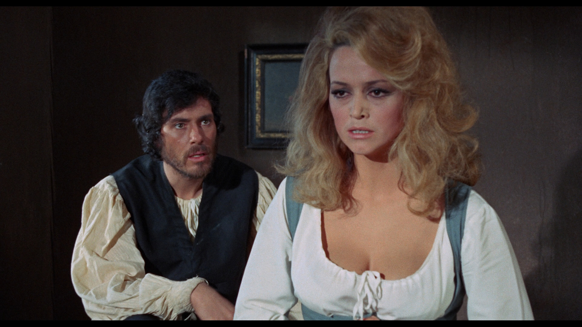 restoration from the camera negative that makes this far more pleasant to sit through than the terrible prior versions; the colors and detail here are remarkable with some reds and greens that will make you gasp. The DTS-HD MA 2.0 Italian track is also perfect and features optional English subtitles. (Apparently an English dub was never prepared, and this was barely exported anywhere at the time.) This is also the slightly longer version never seen before on home video, restoring a little bit of extra nudity and writhing during the orgy scene. A new audio commentary by Annie Rose Malamet works up a lot of enthusiasm for this film with comments about Neri's star presence, the subversive aspects of female sexuality in genre cinema, the red color coding in the costumes, and those unmistakable Rollin-esque touches, among other topics. The video essay "Lady Of The Night: The Feminism Of Rosalba Neri" (16m44s) by Alexandra Heller-Nicholas features pretty much every shred of screen nudity Neri ever did while running through the actress' work in Slaughter Hotel, Amuck, Lady Frankenstein, The Devi's Wedding Night, and this film. Finally in "Out Of The Woods" (25m21s), Woods covers the various phases of his acting career including his work as a dubber, his theater roles, his early break in Otto Preminger's The Cardinal, and his move to Italian westerns that led to a prolific career in Euro projects like this one.