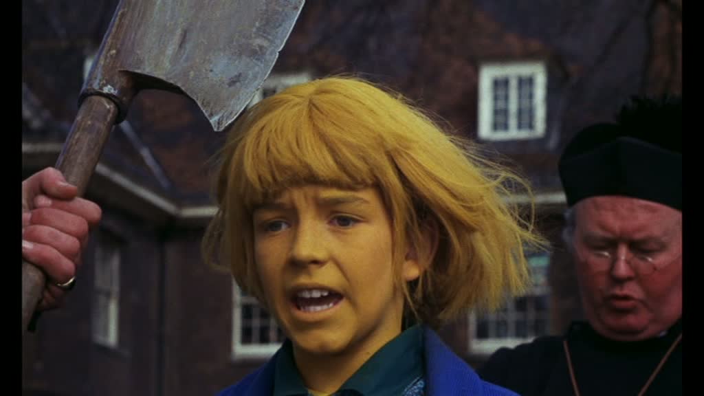Next is the most familiar title in the set and the reason many will snatch it up: 1972's "The Boy Who Turned Yellow," directed by Michael Powell three years after his last feature-length theatrical film, Age of Consent. Again this clocks in at just under an hour and offers a very bizarre lesson about electricity couched in the story of moppy-haired John (Dightam), who goes with his class on a field trip to the Tower of London with his pet mouse tucked away to keep him company. Unfortunately the mouse gets loose, which distracts John back at school so much he gets sent home after drifting off to sleep. On the way home on the subway, a burst of electricity turns him along with everyone (and everything) else a bright shade of yellow. Medical attention doesn't provide any explanation, and that night John is visited via his television by an odd person of possibly extraterrestrial origin named Nick (Eddison), who wears a flashing yellow light on his head and takes John on a trip through electrical waves back to the Tower of London. Much mayhem ensues.