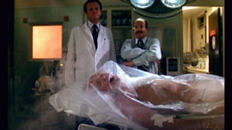 land of America. However, as we soon see, the lucky chosen few don't actually get to make that trip; instead they're gassed, filled with chemicals while unconscious on an operating table, and stuffed into body bags in a secret storage area inside a research facility. One of the clones bound for America, Richard (Donnelly), becomes concerned when he finds a mysterious Old Milwaukee beer can and asks the good doctor about it. When the answer proves unconvincing, Richard does a little snooping with the aid of his beautiful girlfriend, Lena (Breen), and discovers the horrible truth: everyone there is a clone being cultivated for a sinister purpose involving politicians outside in the real world. After escaping from Clonus and running through the desert, Richard finds the world outside is very different from what he imagined and his story less than believable.