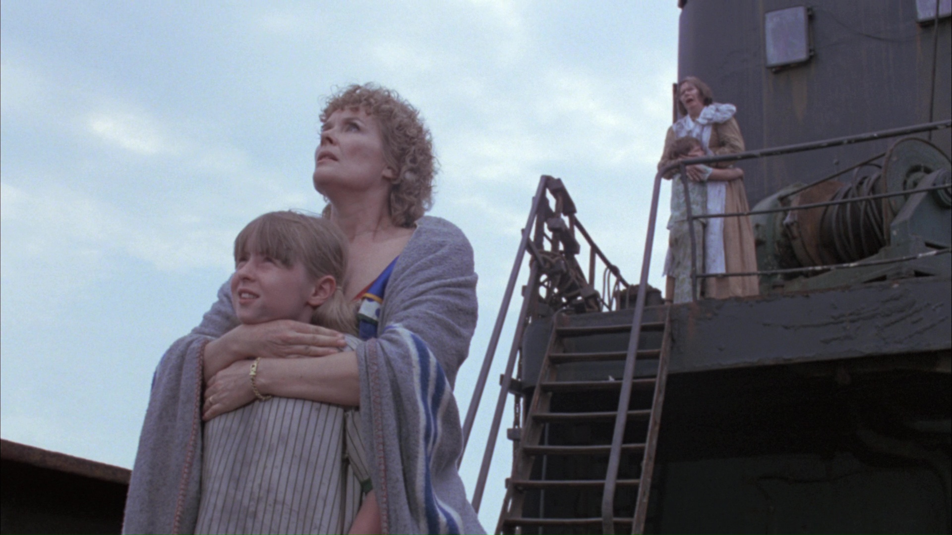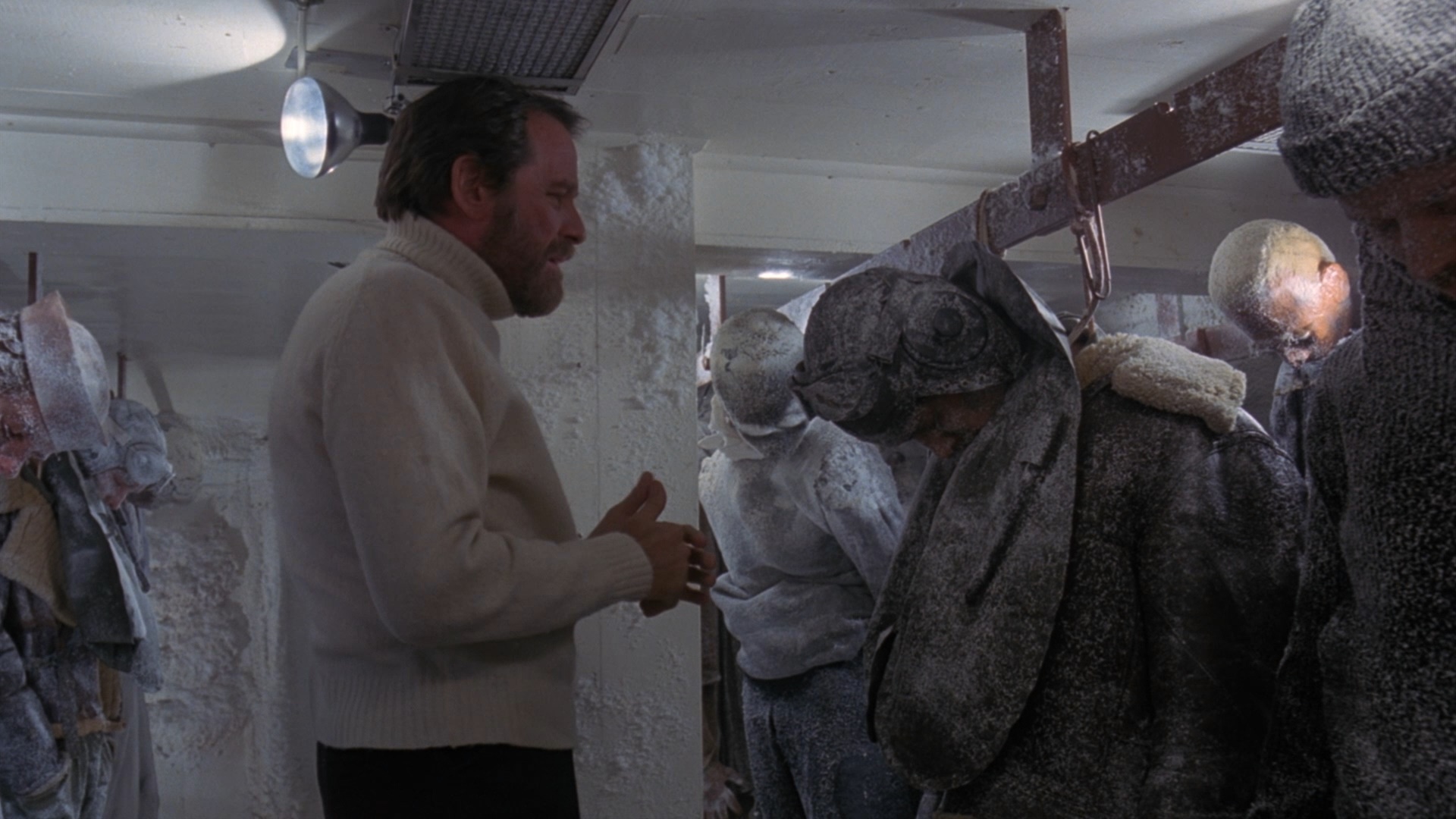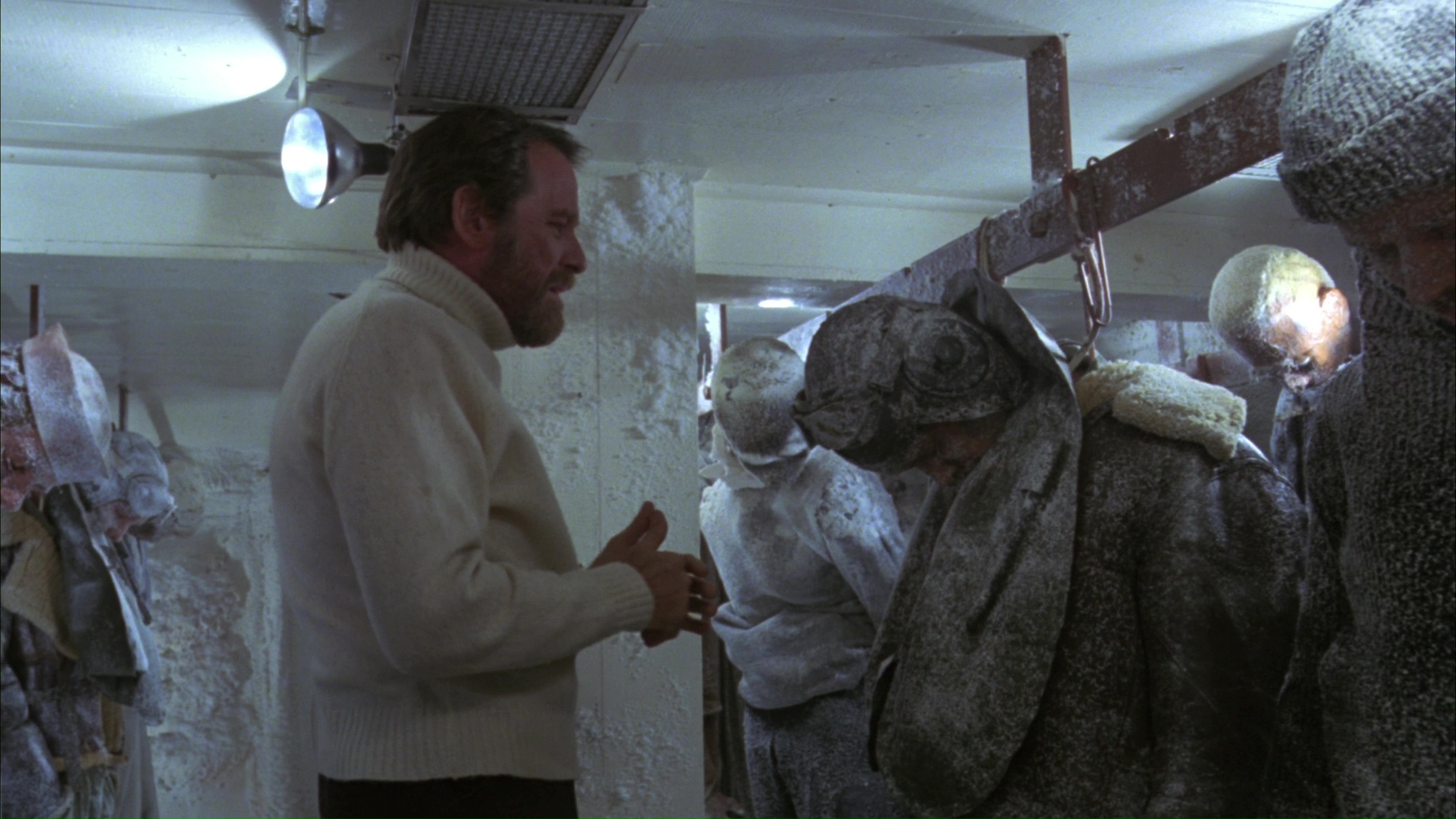 It took another five years, but America finally got its own special edition of Death Ship in 2012 as part of Scorpion's horror line, Katarina's Nightmare Theater. As you can probably guess, cheeky hostess Katarina Leigh Waters does spirited video wraparounds and even contributes a video bonus, "Learn What the Ship Is Saying," in which she offers a Mel Brooks-style translation of the death ship's German commands. There's also an isolated music score (a very nice touch considering the music never had a commercial release), those three-plus minutes of VHS-sourced deleted scenes, the American trailer, and bonus previews for titles like Silent Scream, Humongous, The Hearse, Don't Answer the Phone, and Mortuary. As for the film itself, it looks pretty darn good; the transfer on the DVD edition (the first version released by a couple of months) is given plenty of breathing room (it's a dual-layered disc with the feature taking up over an entire layer); you'll see some softness and speckles during the opening credits as usual (those optical always looked a little iffy), both otherwise it's smooth sailing. (And yes, that shower scene is nice and clear, so no worries there.) As usual, the cover art retains the terrific original poster art (reused again years later for Warner's Ghost Ship). The Blu-ray version is taken from the same HD source, obviously, and features the expected bump in clarity with details like clothing patterns and facial hair registering more clearly. It's also worth noting that the color timing of this film has always been a little wonky; 35mm prints had a gray, bleak appearance (which you can tell from the similar trailers circulated on comps over the years), and while the UK disc appears to have been digitally swerved to color correct it to something closer to a "normal" palette (pumped up yellows and reds, for example) along with some sharpening in the process and extremely harsh whites, the Blu-ray in particular has a more restrained, cold appearance. Individual tastes will vary, of course.