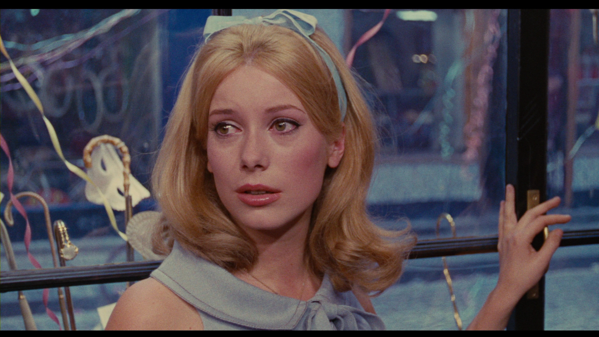 Despite its popularity, Umbrellas took a while to make it to Blu-ray (apart from a middling Japanese release from an outdated master) due to a revised restoration for the HD era overseen by Demy's family and premiered at Cannes in 2013. Not surprisingly, the Blu-ray in all three of its incarnations (American, French and British) is pure eye candy from start to finish with an often eye-popping appearance that's as close to the initial film restoration as you can possibly get in a home theater. In particular, the scenes shot with vivid red walls now register far more cleanly and impressively here, and every single shot finally has that "wow" factor felt on the big screen. Beautiful work. The extras from the Arte DVD are carried over for their Blu-ray, which also tosses in a generously illustrated 72-page book (in French), a look at the restoration, a brief 1976 Deneuve TV appearance discussing the film, and vintage footage of the film's Prix Louis Delluc win and Jacques Demy and Mag Bodard discussing it as well in 1985. The UK Blu-ray instead has a 66-minute audio interview with Deneuve, an 11-minute critical featurette with Geoff Andrew, the Ledoyen piece, the full 51-minute making-of doc, and The World of Jacques Demy, Varda's amazing 90-minute documentary about his entire career, packed with incredible on-set footage. If you ever wanted to see Jim Morrison visiting the set of Peau d'âne, this is the place. The Criterion disc also features the full Once Upon a Time... doc, the reissue trailer, and the same restoration demo from the other releases, but otherwise it sets itself apart courtesy of a new 22-minute film scholar piece with Rodney Hill (who makes some nice points about the film's combination of aesthetics, music and emotion), and an 11-minute vintage French TV interview with Demy and Legrand (from Cinepanorama again) complete with piano performances of the key music themes and some fascinating comments about Demy's relationship with Varda. There's also an audio excerpt of Legrand lecturing in 1991 about his work on Demy's films (26 minutes, in English) and an 11-minute chat with Deneuve from a 1983 appearance about Demy, both at the National Film Theatre.