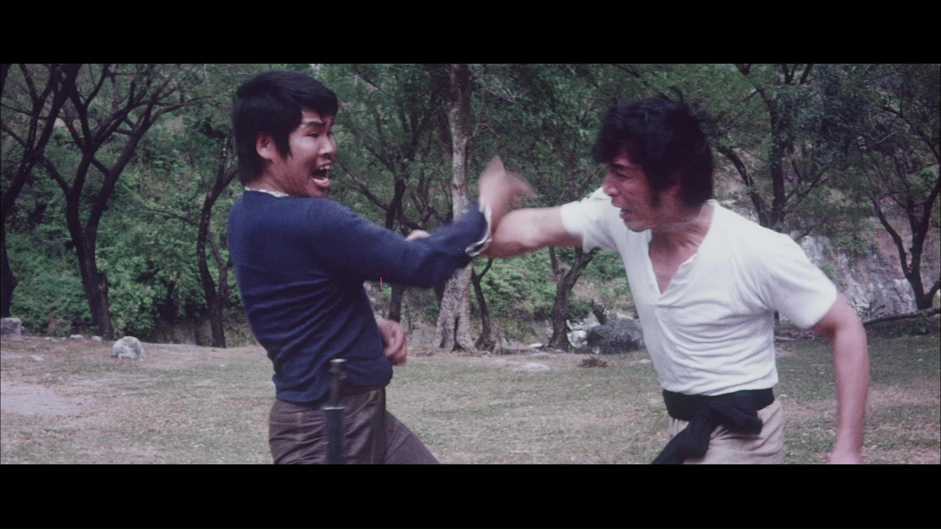 but fortunately it doesn't matter all that much given that the film is about 90% fight scenes. This one was first released by Code Red on a double-disc DVD set, Maria's Kung Fu Mayhem, along with such other titles as Angry Dragon, Revenge of the Dragon, Fist of the Double K, and Mandarin Magician. The scope transfer of an English-dubbed print is again restrained by the source, naturally, and the SD presentation looks basically identical to what's on the DVD. It makes a more suitable fit here though given the nature of the films and the fact that they share one star, Yukio Someno, who seemed to have a brief corner on the market playing Japanese bad guys in Hong Kong movies. Theatrical trailers for both films are also included.