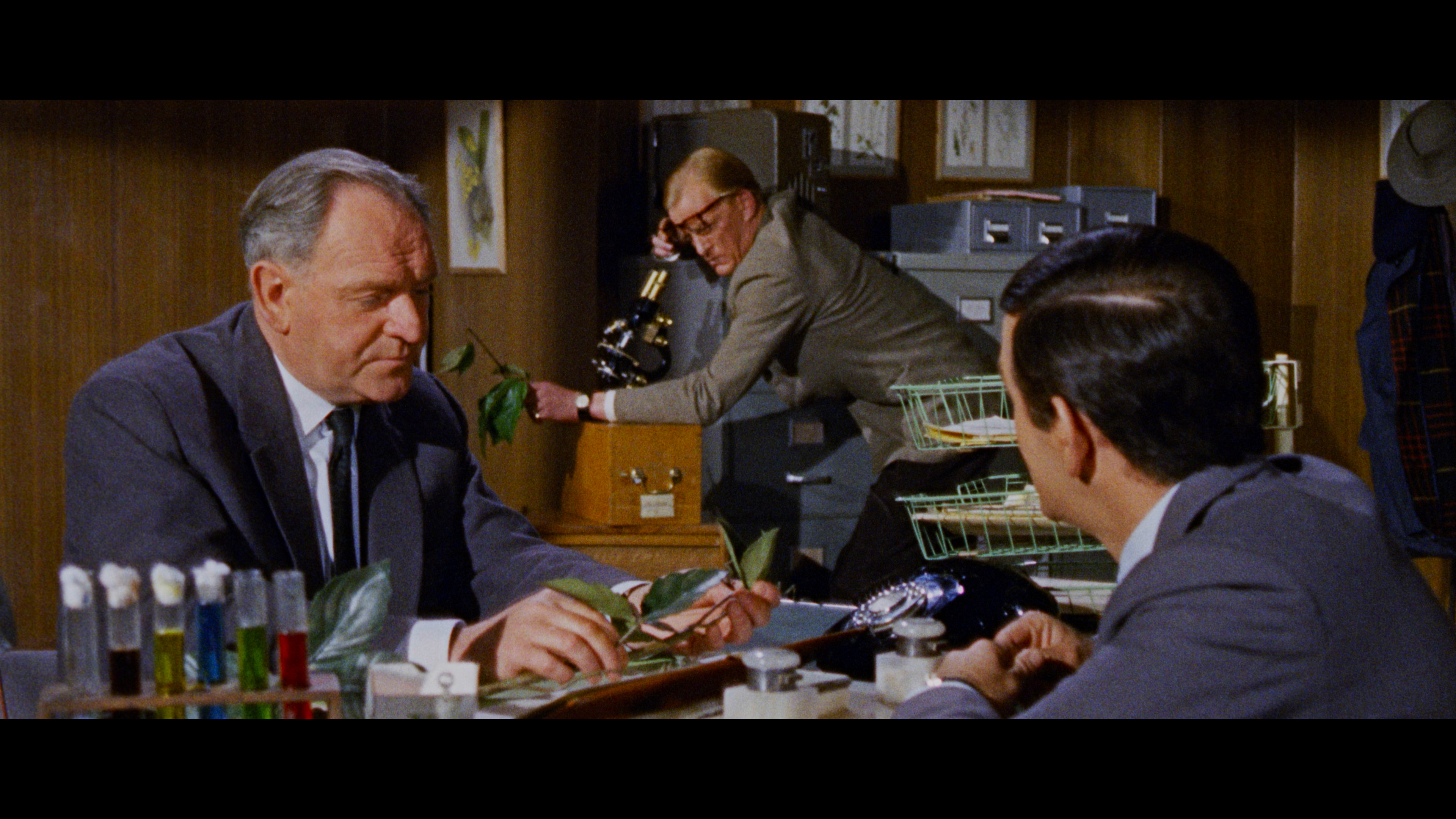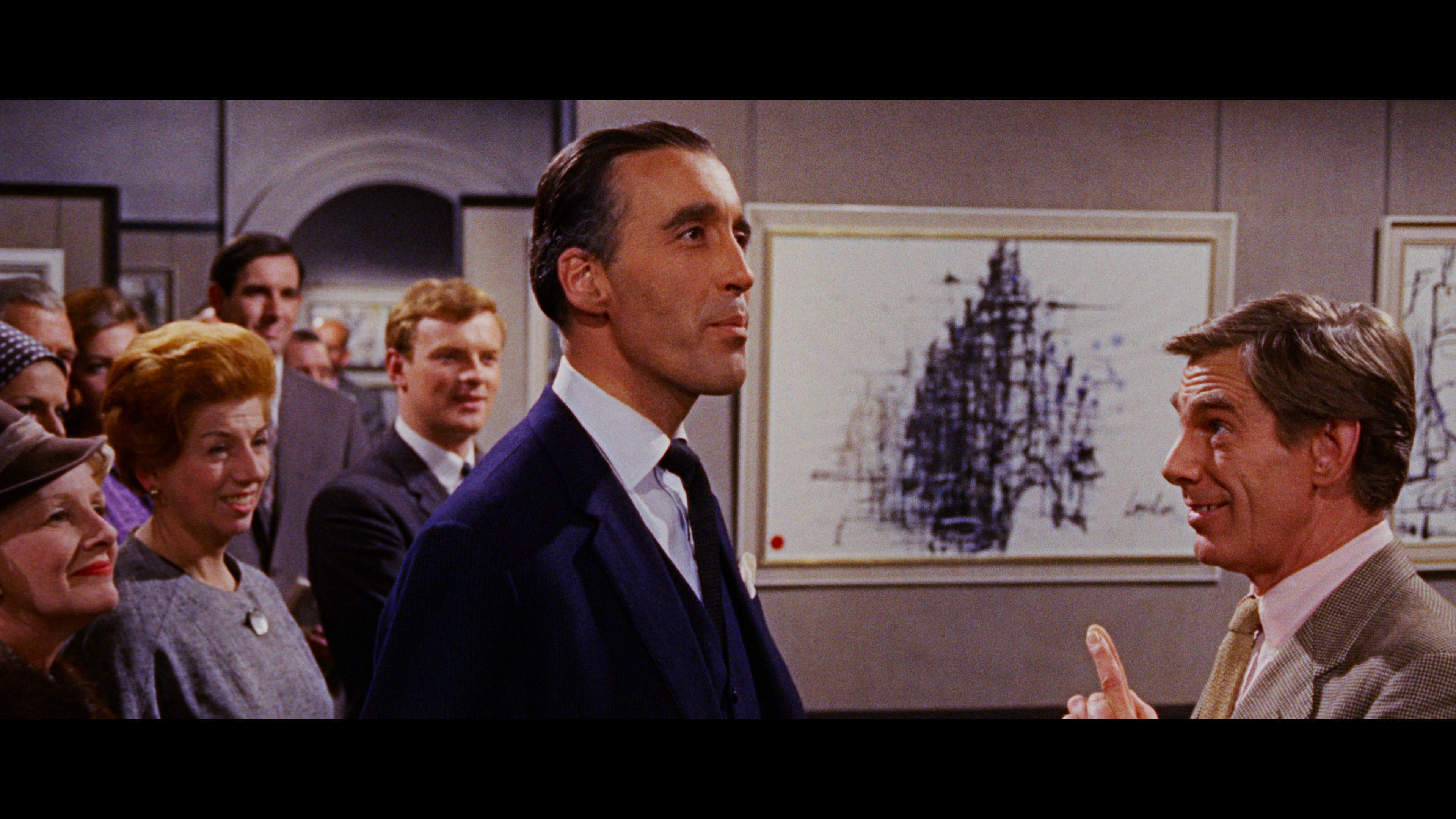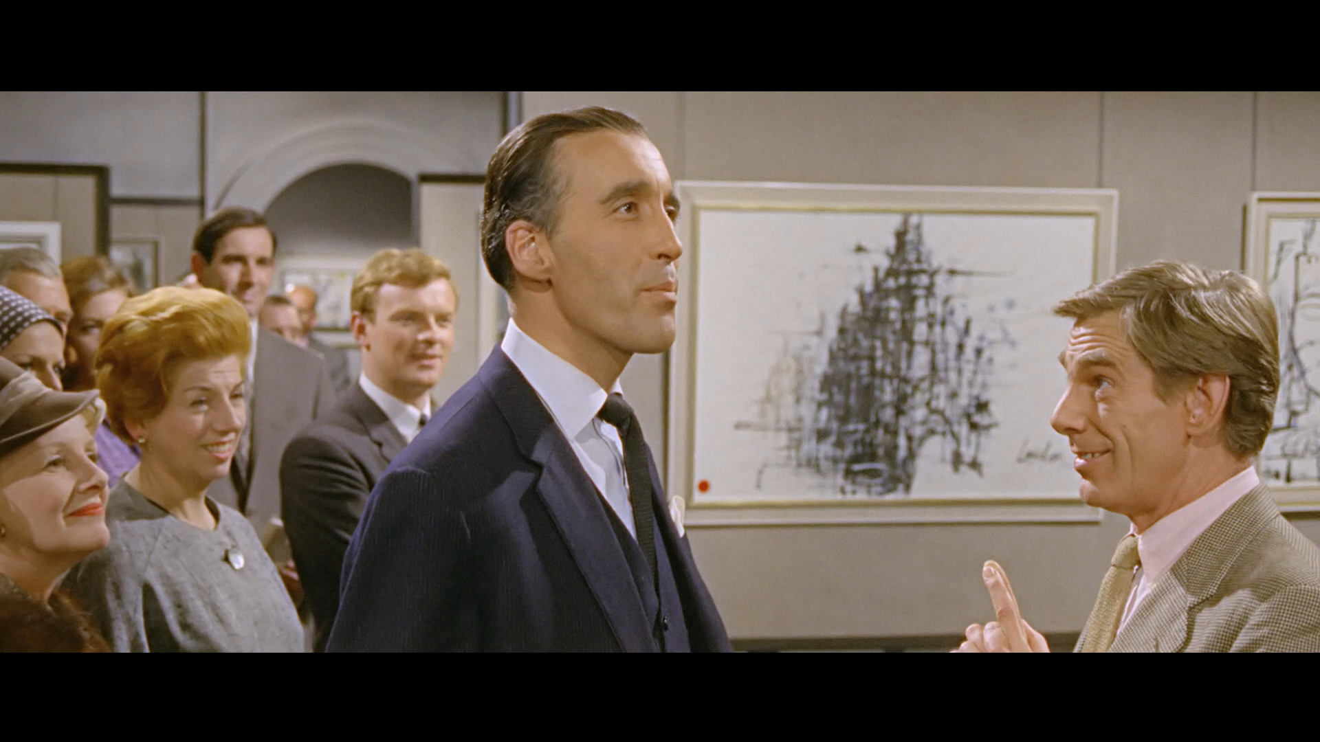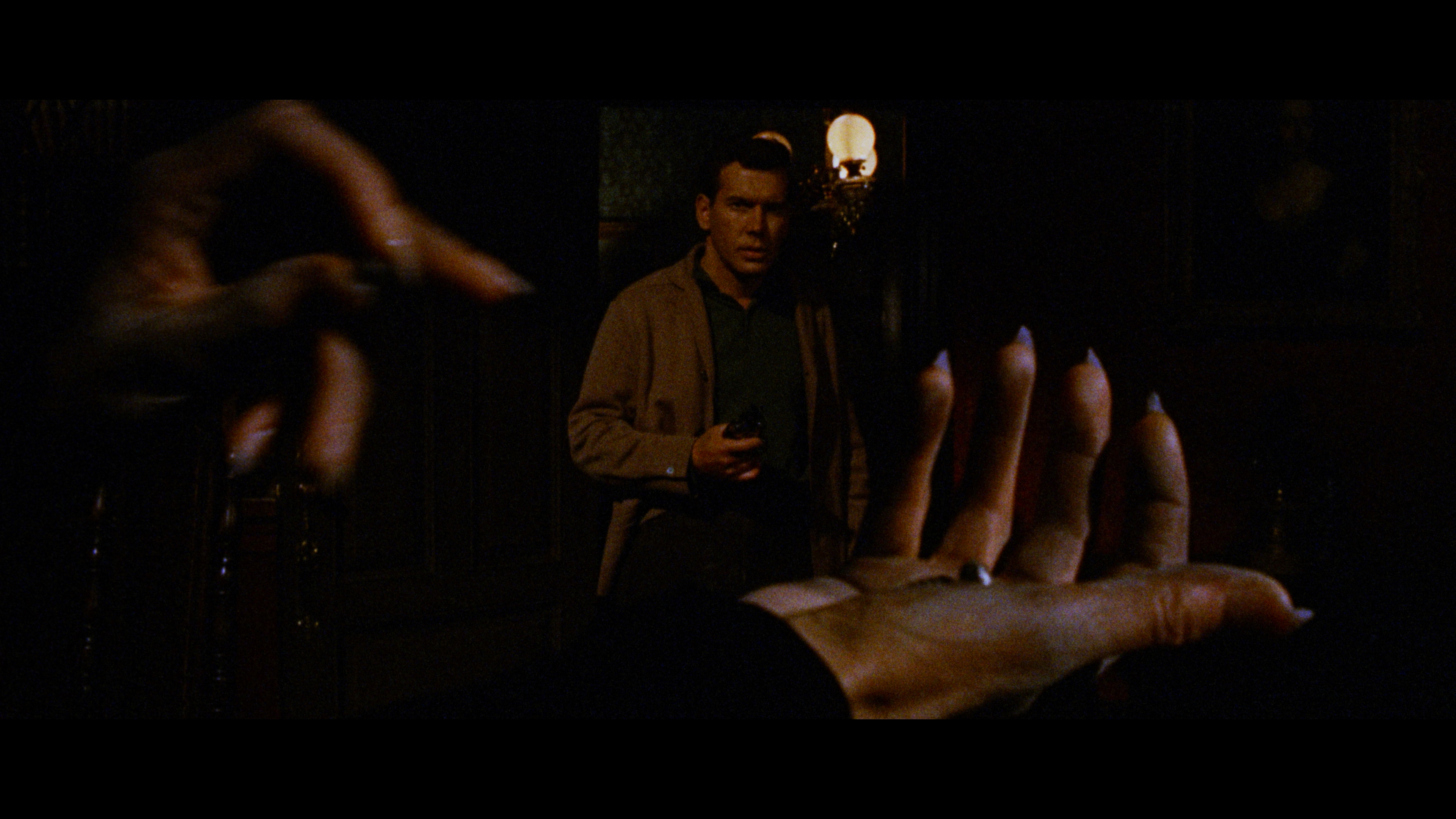 (calling Paul Naschy!). Then Bill Rogers (legendary disc jockey Freeman) and his family come back from vacation only to find their house being threatened by a very aggressive vine that quickly grows out of control and seems to be impervious to any attempts to stop it. Then a visit to the West Indies for a jazz gig leads musician Biff Bailey (Castle) to witnessing a nocturnal voodoo ritual where, despite warnings to the contrary, he hastily scribbles down the tribal music to use back home. What could possibly go wrong? In the most famous segment, snooty art critic Franklyn Marsh (Lee) is locked in an ongoing battle of barbs and wits with a crafty painter (Gough) that ultimately leads to death and a rampaging severed hand. Finally, Dr. Carroll (Sutherland) brings his new bride, Nicolle (Jayne), from France to his home in America where he comes to believe that she may be a vampire preying on the neighborhood.