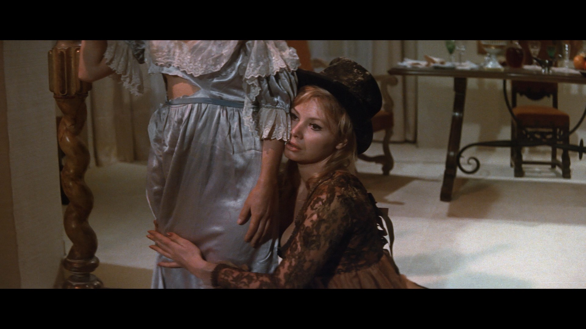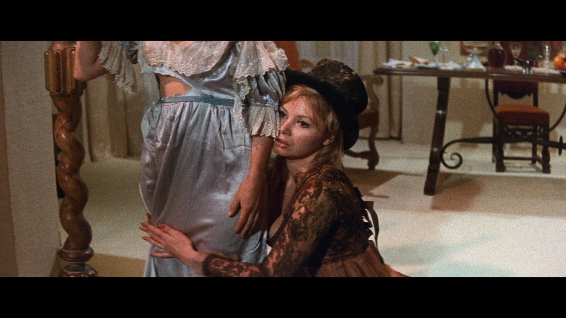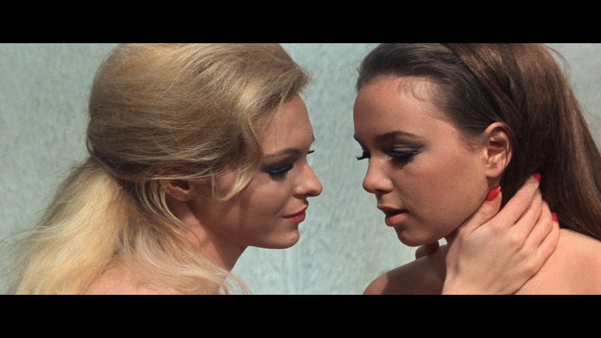 The look of Eugenie has been confounding viewers since its home video debut, adding some fuel to the fire for those who consider Franco a sloppy technician. Several shots dotted throughout the film are obviously out of focus, reportedly due to a cameraman's negligence. Regardless of whether that's true, the tactic works in a handful of shots that drift in and out of focus, not exactly inappropriate for the kinky, voluptuous dreaminess of the film itself. In any case it's also a stylish and often striking film with Franco's trademark seaside landscapes and sparing but effective use of color gels creating a enjoyable candy dish of visual goodies. That look is served well by Blue Underground's initial 2015 Blu-ray (with an updated DVD included as well along with a third disc, the CD soundtrack, which mirrors the contents of the first disc in the long-discontinued Digitmovies double-disc release). The scenes with heavy red filters benefit especially well with a great increase in detail and overall resolution freed from the constraints of NTSC smudging, while the daylight exteriors now look pristine and pin sharp. The English audio track is presented in DTS-HD mono, sounding excellent, with optional English SDH, French, or Spanish subtitles. Carried over from the prior DVD is the theatrical trailer (which is quite good) and a 17m32s featurette, "Perversion Stories," featuring recollections from Franco and Liljedahl (in a rare on-screen appearance), and more briefly, Lee and Towers. Franco and Lee are the best raconteurs, not Eugeniesurprisingly, but all have some fun stories about the shoot and its marketing as a sex film, which made sense at the Eugenietime but doesn't really capture the full scope of what's in store here. New to the release is an improved HD stills and poster gallery and the participation of Stephen Thrower, whose writing on the film in his essential book, Murderous Passions: The Delirious Cinema of Jesús Franco, has been adapted into new liner notes (replacing the ones by Tim Lucas for the original DVD). Thrower also appears for a new 18m9s featurette in which he runs through this portion of the Towers/Franco era, Franco's trajectory of de Sade adaptations, and the necessary departures from the source material that resulted in one of Franco's first full-strength sado-erotic masterpieces.