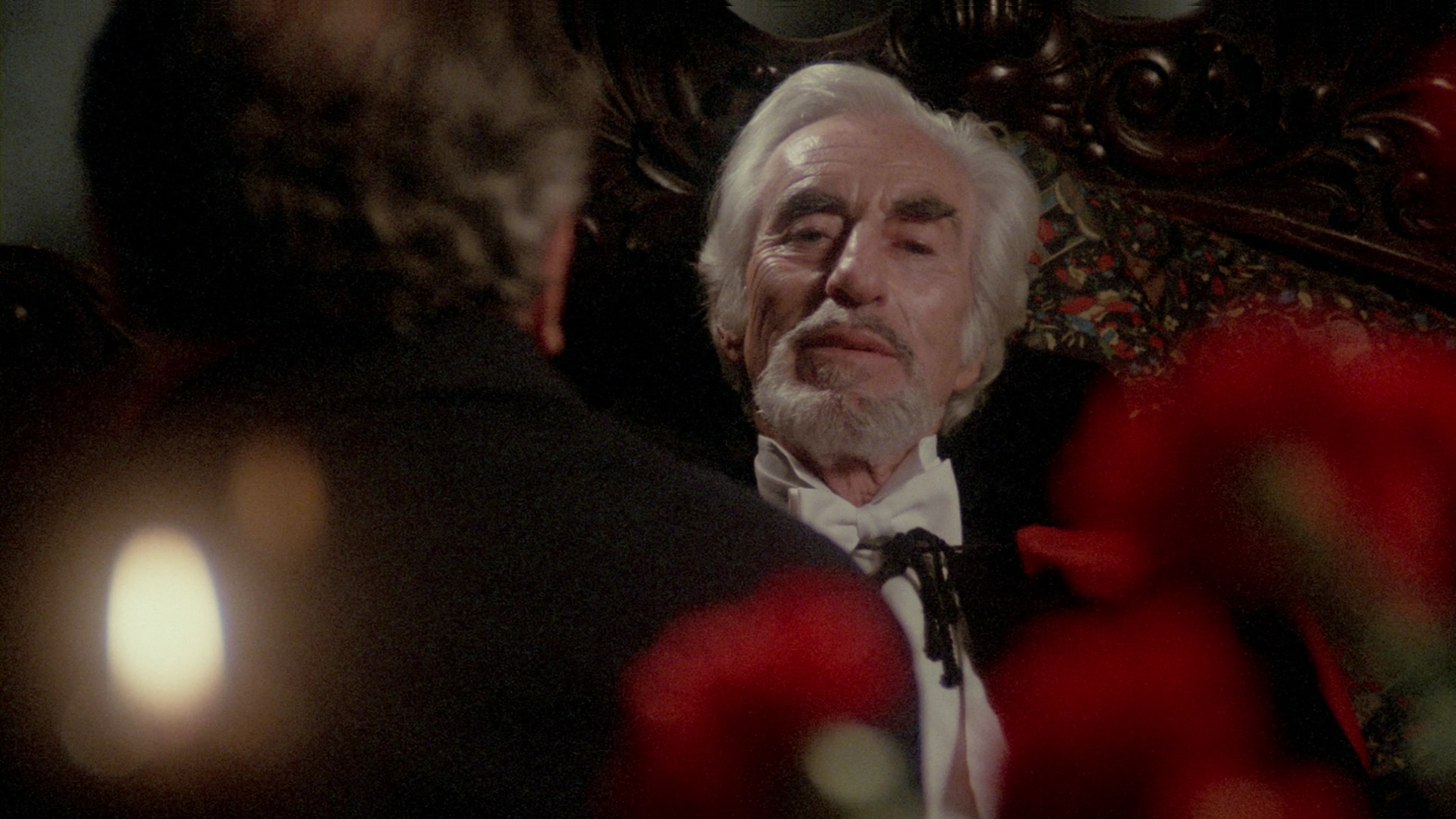 We find out about Radzoff's homicidal tendencies early on when he grows frustrating with the insults of his director, whom he shoves off a balcony with his cane. Soon after the thespian suffers a heart attack during an appearance for a college's horror film society and gets carted back home, where he expires just after using the last of his energy to snuff out his opportunistic manservant. He leaves behind a grieving widow (Pilavin) at his funeral, for which he's specially recorded a videotaped message to the attendees. In fact, he even has taped greetings planted in his elaborate mausoleum, which several of the college horror fans target to break in that night to honor his memory in a more unorthodox fashion. Some clowning around soon leads to them hauling his body out of the coffin and dragging it to their improbably elaborate, antiquated headquarters, a spooky mansion festooned with horror posters and a former shooting location for some of Radzoff's biggest hits. The widow soon learns of the body's disappearance and orchestrates a seance, which of course results in the dead actor soon rising up in a foul mood looking to dispatch justice on those who disturbed his eternal slumber.