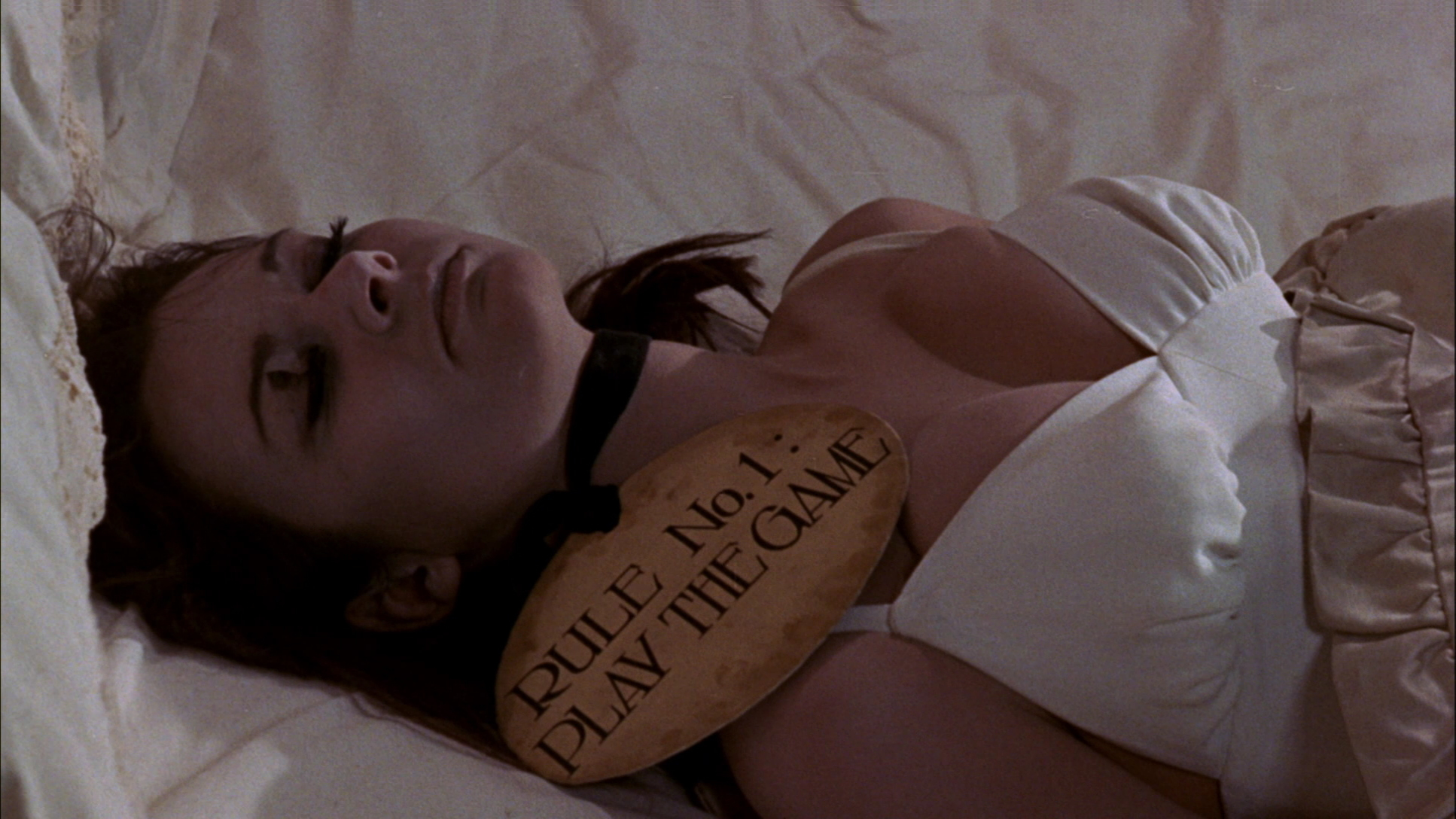 In a remote English manor, emotionally stunted Girly (Corruption’s Vanessa Howard) and Sonny (Howard Trevor) still frolic around in children’s clothing while playing juvenile but often fatal games with strangers they encounter. One afternoon at the zoo they befriend an ill-fated tramp who goes home with them and, distracted by Girly’s naughty schoolgirl charms, doesn’t realize their role playing might cost him his head. Their antics are overseen by their knitting-happy guardians, Mumsy (Dr. Terror’s House of Horrors’ Ursula Howells) and Nanny (10 Rillington Place’s Pat Heywood), who encourage the youngsters to handle any unruly new family members by sending them off to the angels. Enter their latest “New Friend” (The Stone Tape’s Michael Bryant), a particularly long-in-the-tooth gigolo whose latest patron (El Condor’s Hassall) runs afoul of Girly and Sonny, leaving the newcomer to upset the homicidal family order when he decides to have Girly to himself.
