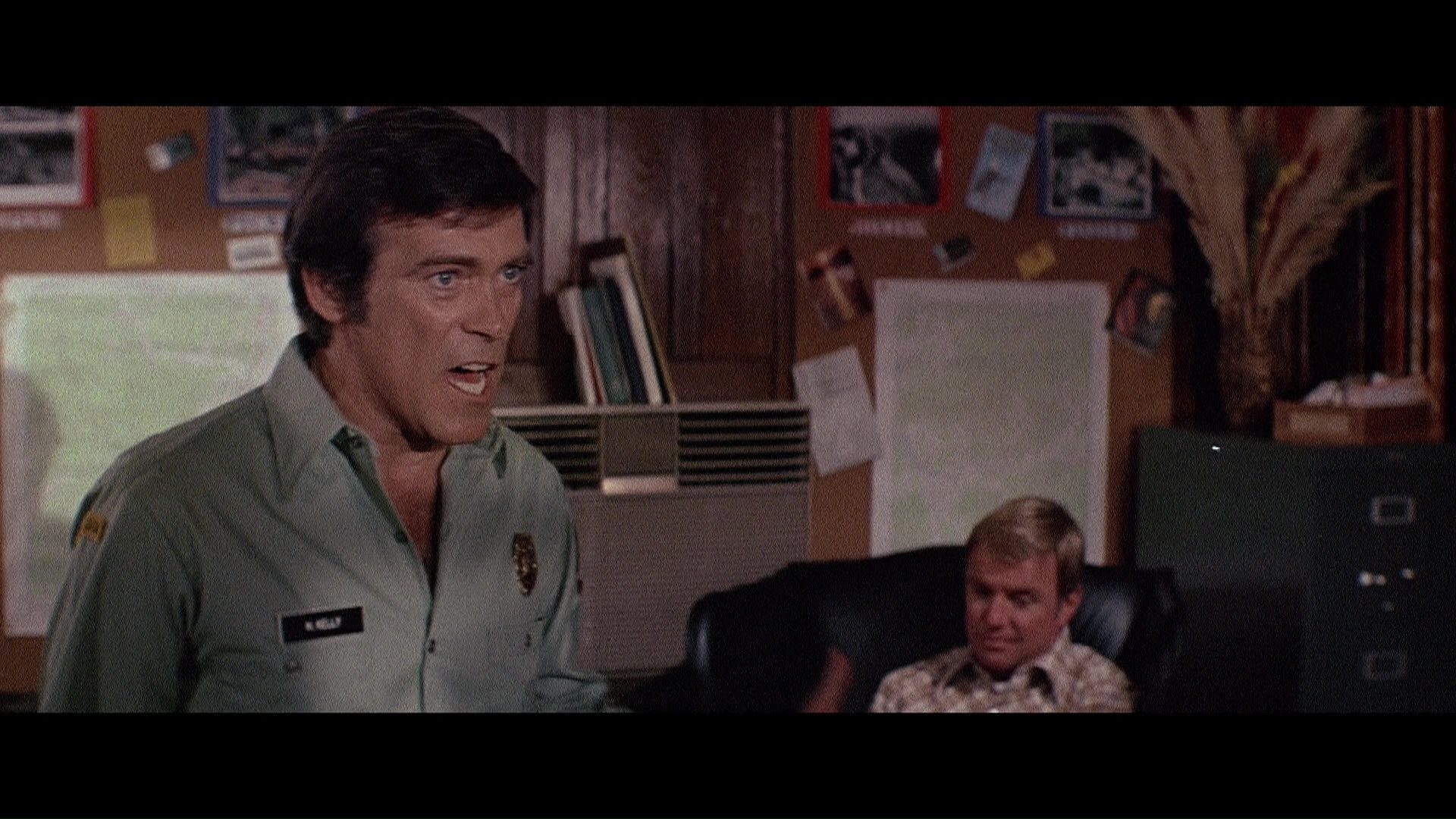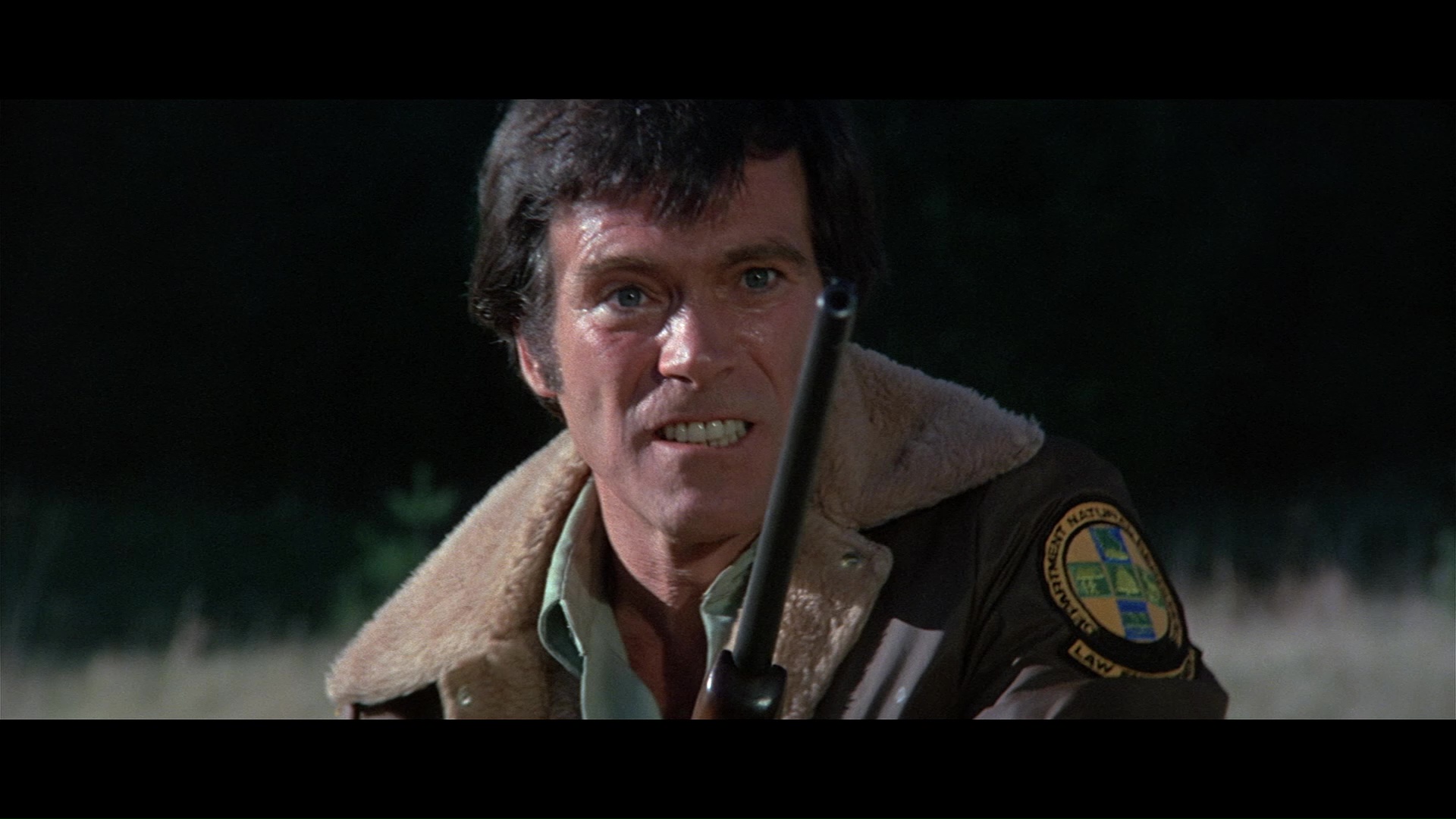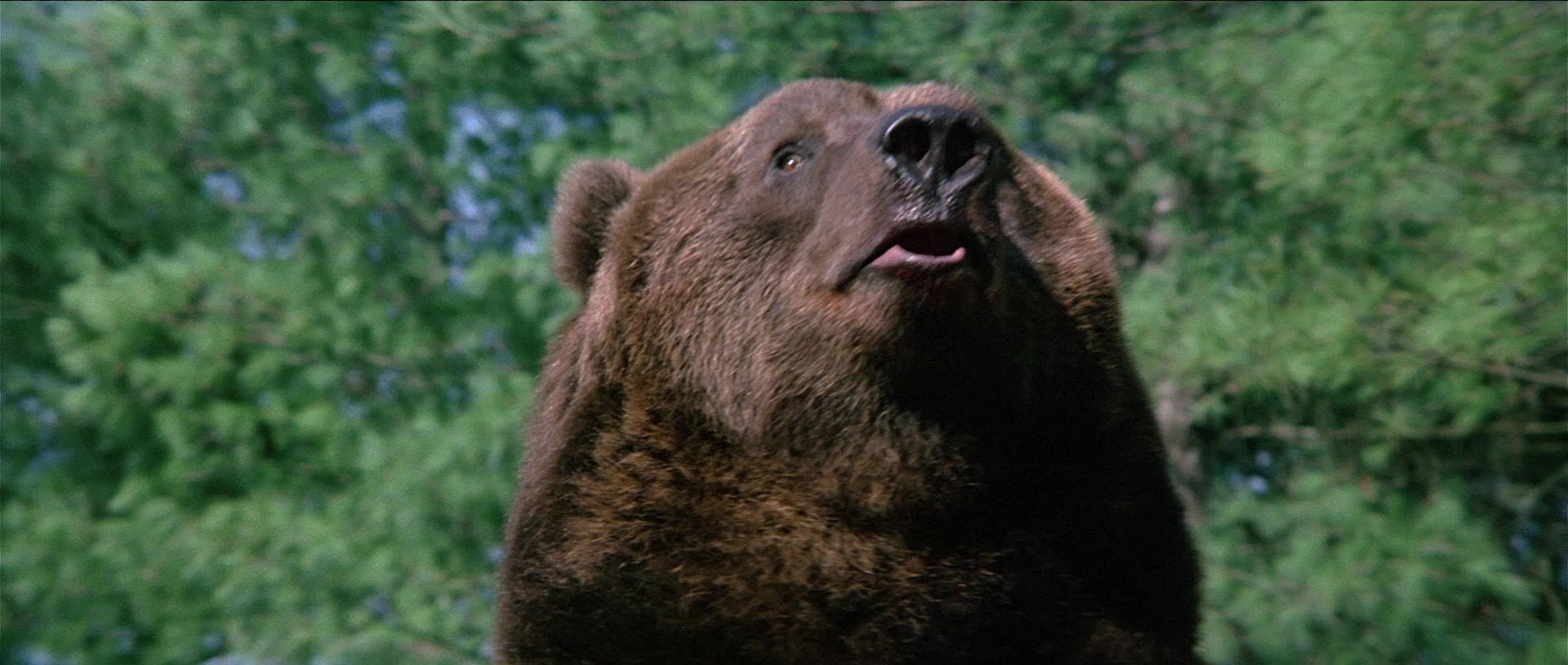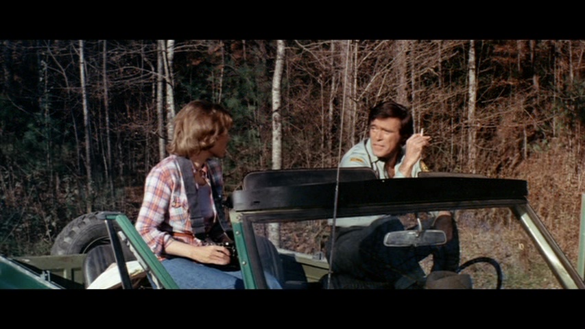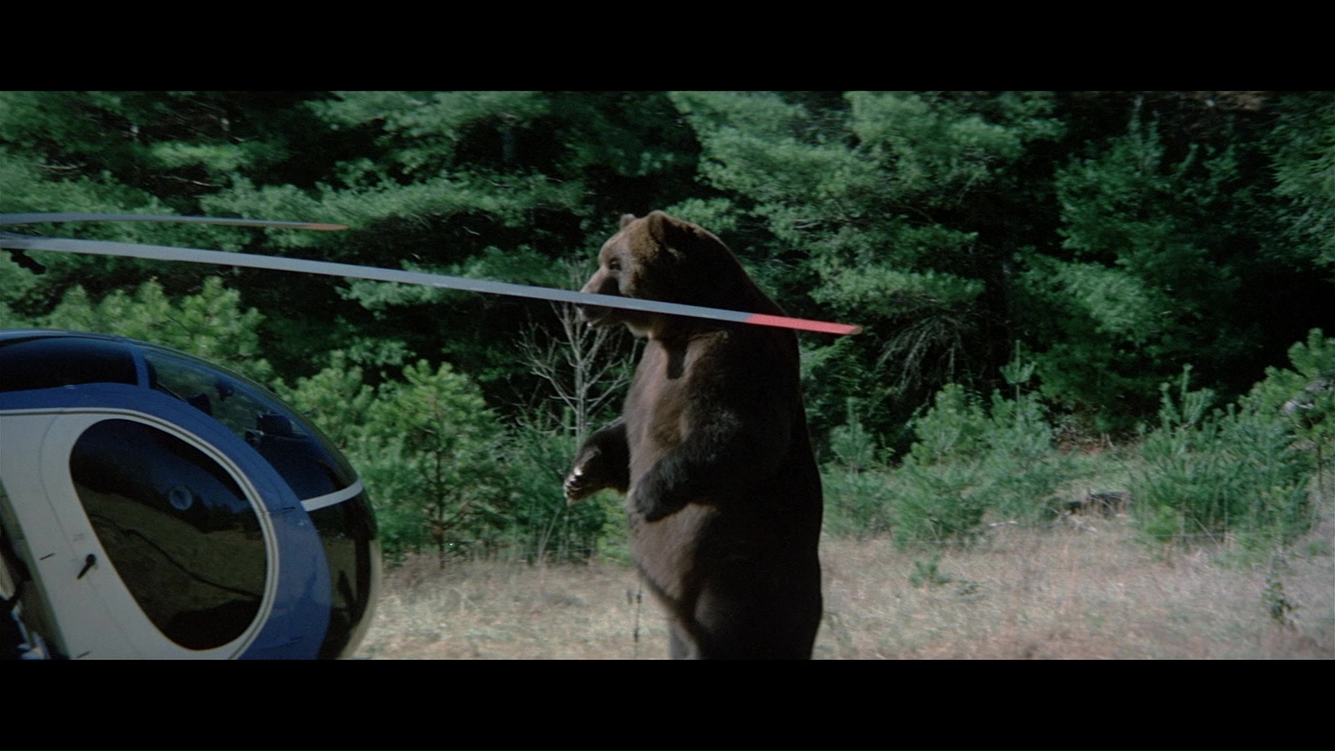 Later the same year, Scorpion brought the screen's favorite rampaging bear back to the Blu-ray with a remastered edition featuring a new scan from the interpositive. As you'd hope, it marks for a substantial upgrade with a more natural presentation of film grain, fresher colors, and a very substantial amount of additional image info visible on the edges during the second and third reels in particular a la the old DVD. (Images in the body of this review are from the 2018 Scorpion release; comparison ones can be found below.) Audio options include the standard 2.0 stereo track, a spacious and surprisingly boisterous 5.1 mix (both DTS-HD MA), and a mono music and effects track (Dolby Digital). English SDH subtitles are also provided. Almost everything from past U.S. releases is finally collected here together in one place: the Sheldon/McCall commentary, "Jaws with Claws," vintage making-of, the New Beverly panel, still gallery, and Katarina "fun facts." One major new bonus here is a very lively and informative audio commentary by Lee Gambin, whose peerless expertise in the animal attack subgenre is in full bloom here as he tackles one of the decade's most essential entries. He touches on Edward L. Montoro (the infamous head of distributor Film Ventures International), other killer bear films like Claws, other potential casting choices like Clint Walker, the joys of animal suits (making this a commentary sequel of sorts to Night of the Lepus), the unreleased sequel, the Jaws influence, and the sweeping score by Robert O. Ragland, just for starters. Two theatrical trailers are also included along with a sampling of radio spots, and the first pressing sold via Ronin Flix and Diabolik features a limited slipcover.