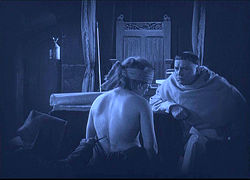 Commonly screened in its 76-minute incarnation with the Burroughs narration, Häxan has run as long as 125 minutes on home video in its slowed down VHS edition from Video Yesteryear. The Criterion DVD is a quantum leap in visual quality over the ragged prints and dupey tapes collectors have had to endure; according to the liner notes, it was transferred from a restoration overseen by the Swedish Film Institute. As with their presentation of The Passion of Joan of Arc, the original foreign language intertitles have been left intact with optional subtitles in English placed at the bottom of the screen. This method takes some adjustment at first, but after a couple of minutes the eye can be trained to read the lower text, not the words in the middle of the screen. The tinting is surprisingly effective, with a hellish rosy red glow rendered over interior scenes and a chilly blue tint added to the exterior scenes, which mostly take place at night anyway. Image quality is very crisp and clean for a film of its vintage, and the expected speckling and tearing is nowhere to be found. The Dolby 5.0 musical accompaniment (with explanatory text included from its organizer, Gillian Anderson)