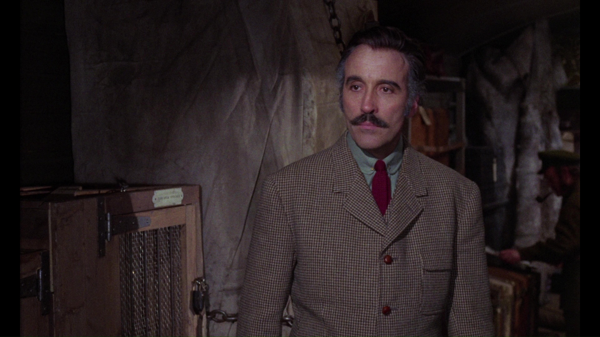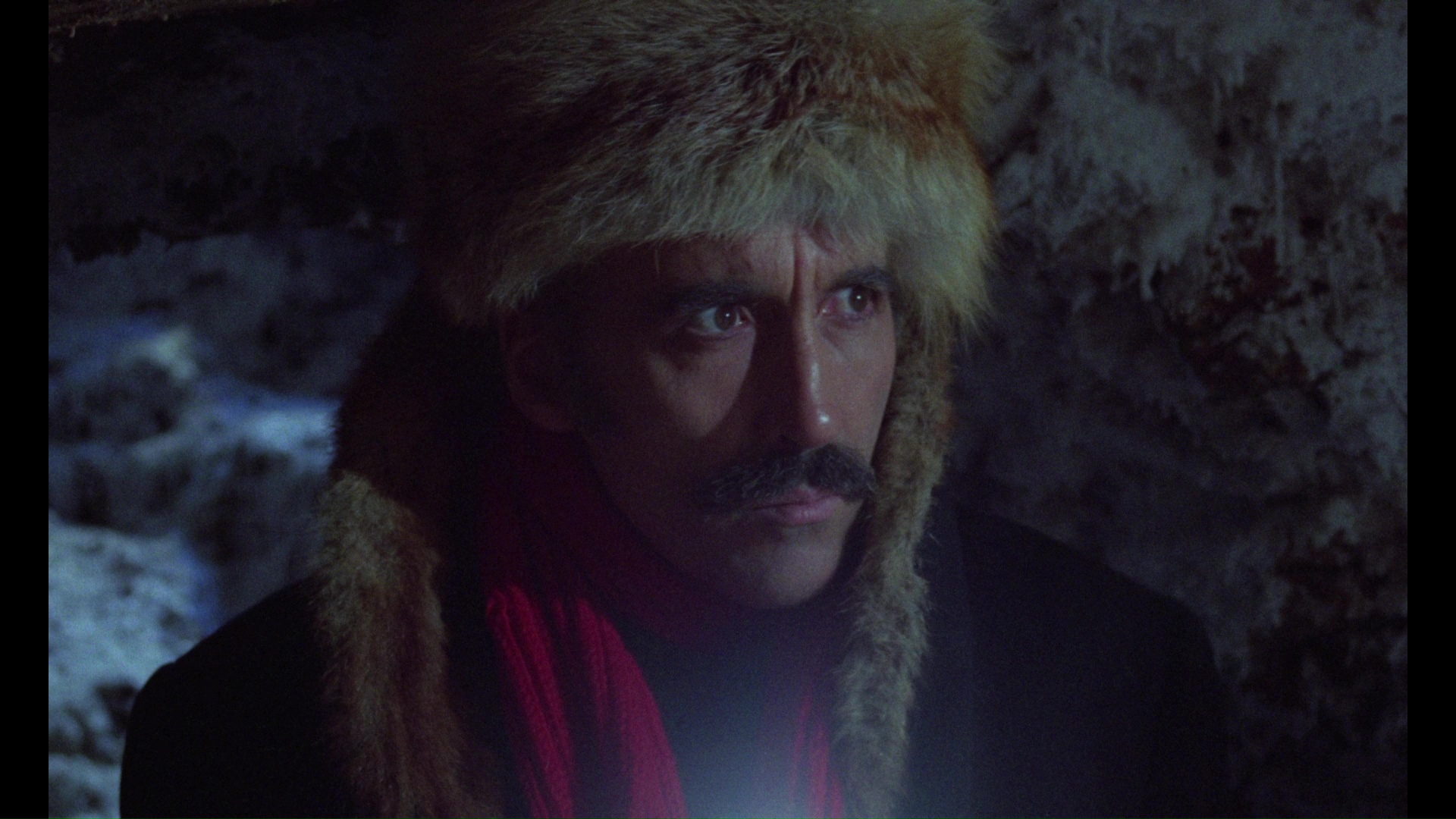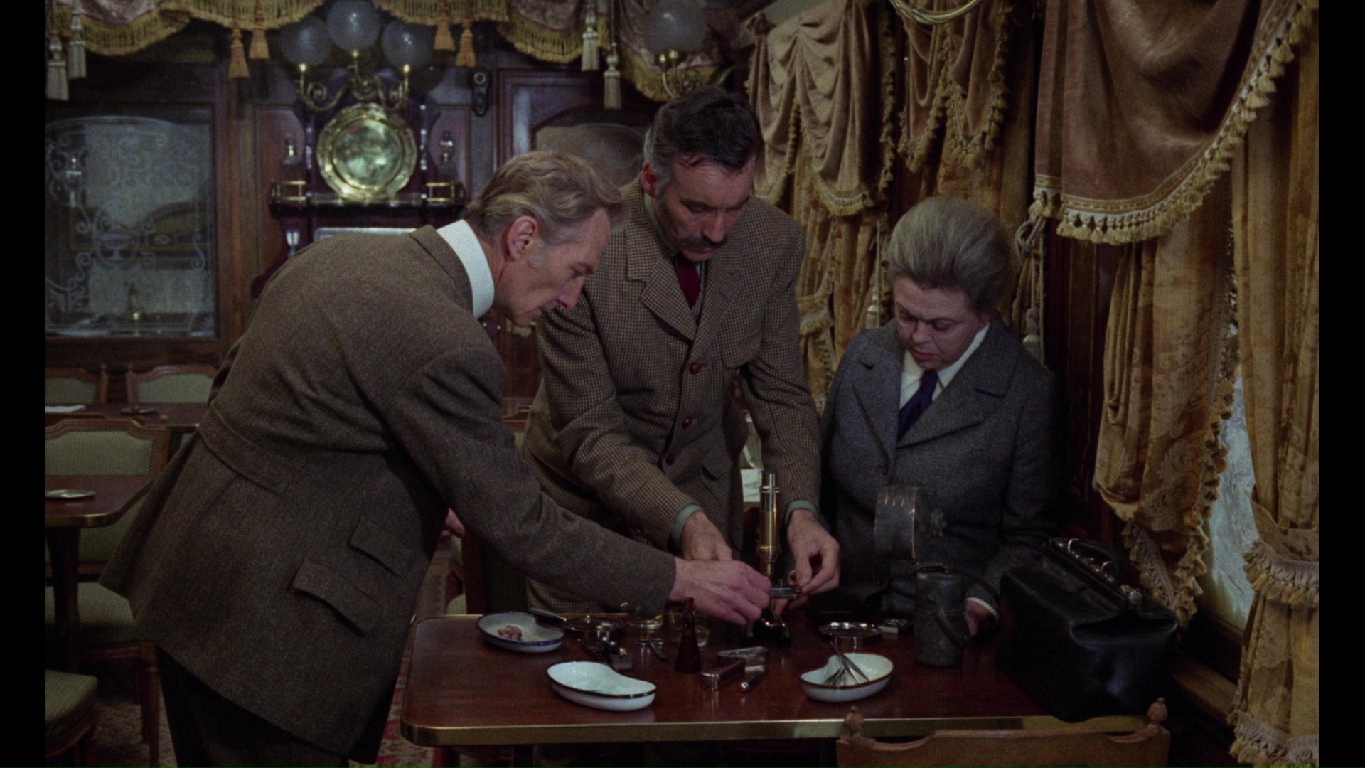 In 2019, Arrow Video offered the film with its first fresh scan in several years, and the difference is quite a significant improvement with much finer film grain, added detail, and a more natural color shift away from the orange cast on the earlier Blu-rays (closer to the cooler look on the Image DVD). The train interiors in particular look much richer with fabrics and glass patterns registering more strongly, and the dark scenes are more atmospheric by a fair margin. (Frame grabs in the body of this review are from the Arrow; comparison ones can be seen below.) The usual English LPCM track is included here, sounding quite nice, with optional English SDH subtitles. The master for this 2K-sourced presentation features the English opening credits and Spanish ones at the end. Ported over from the Severin disc are the "Murder on the Trans-Siberian Express," "Notes from the Blacklist," and "Telly and Me" featurettes, the Alexander intro (playable before the film), and the theatrical trailer, so hold on to the older one if you still want the Cushing audio interview. A new audio commentary with Stephen Jones and Kim Newman takes an appreciative tour through the making of this film including the people behind it, the status of Spanish horror cinema at the time, the differences in Lee and Cushing's acting approaches, and the ambitious, rich nature of the film somewhat camouflaged by its most familiar English title. "Ticket to Die" with screenwriter Steve Haberman (8m31s) examines the film in the context of '70s horror films in the wake of Hammer and as part of Martin's filmography, with some fun thoughts on the contrasting functions and styles of the three leading men as well as the clever use of only two train cars for the shoot. Then filmmaker Ted Newsom turns up for "Night Train to Nowhere" (15m8s) focusing on the role of Gordon, whom he knew, including his career up to this film, the challenges of keeping Cushing involved after the death of his wife, the challenge of booking indie films, and the narrative debt to "Who Goes There?" The package also comes with a reversible sleeve featuring a new design by Graham Humphreys and, in the first pressing only, an insert booklet with liner notes by Adam Scovell.
