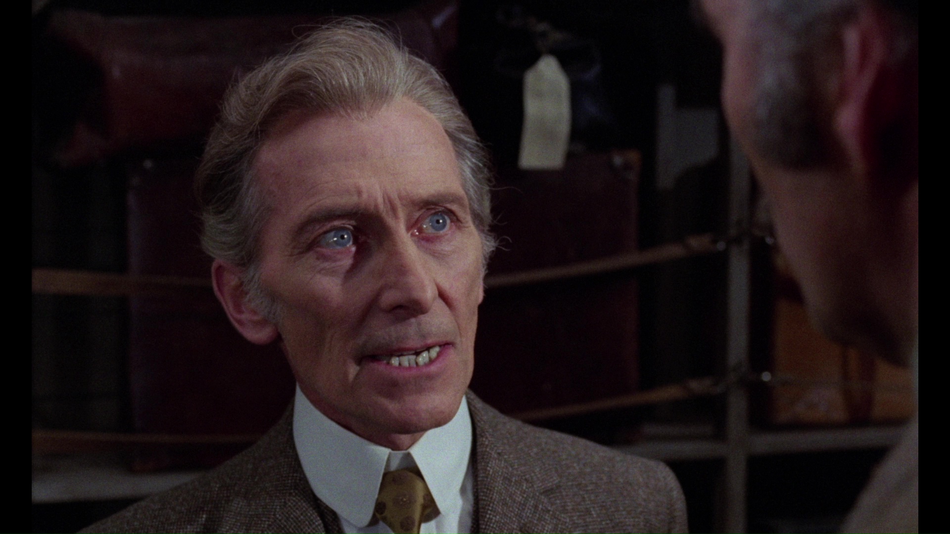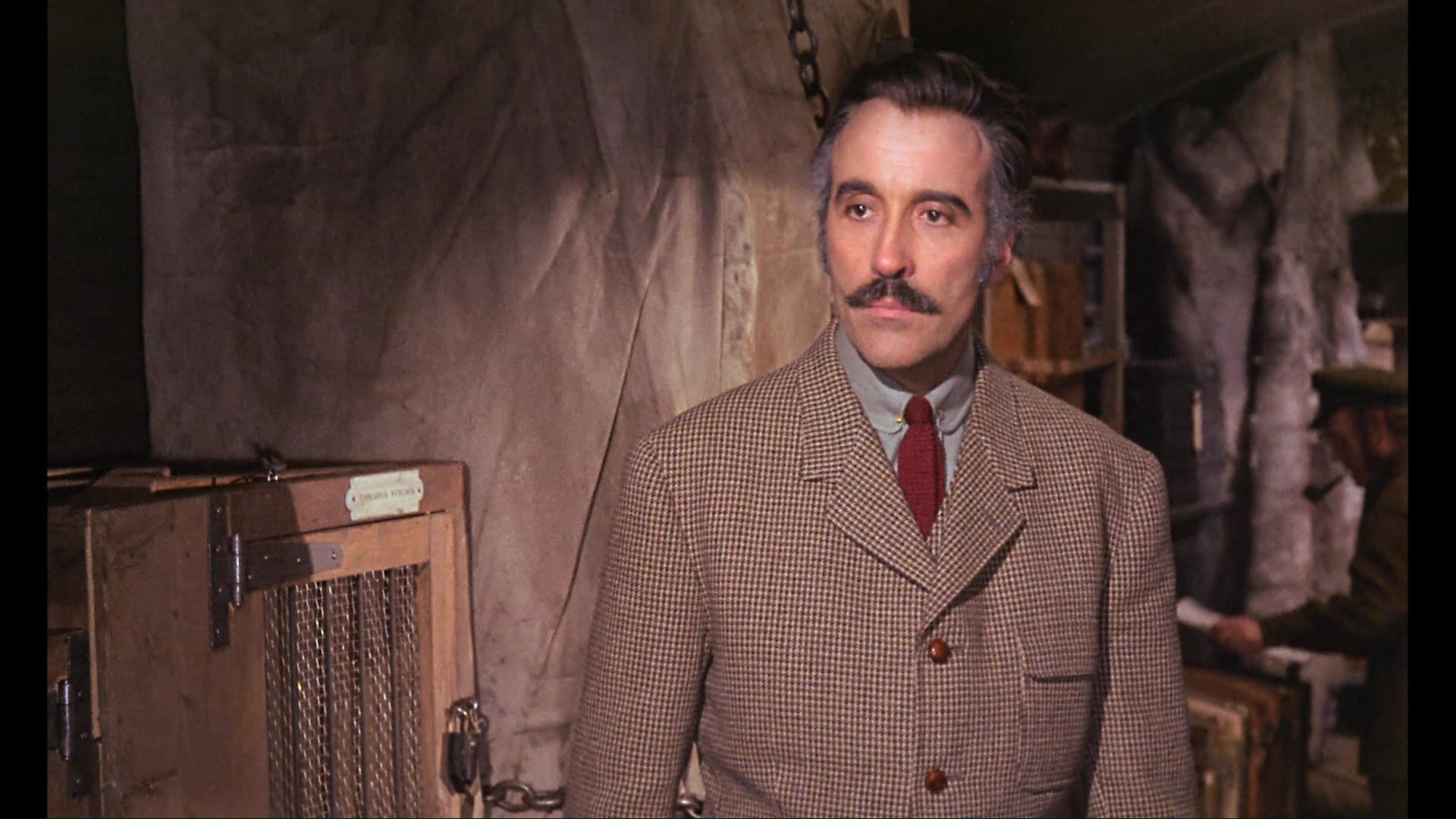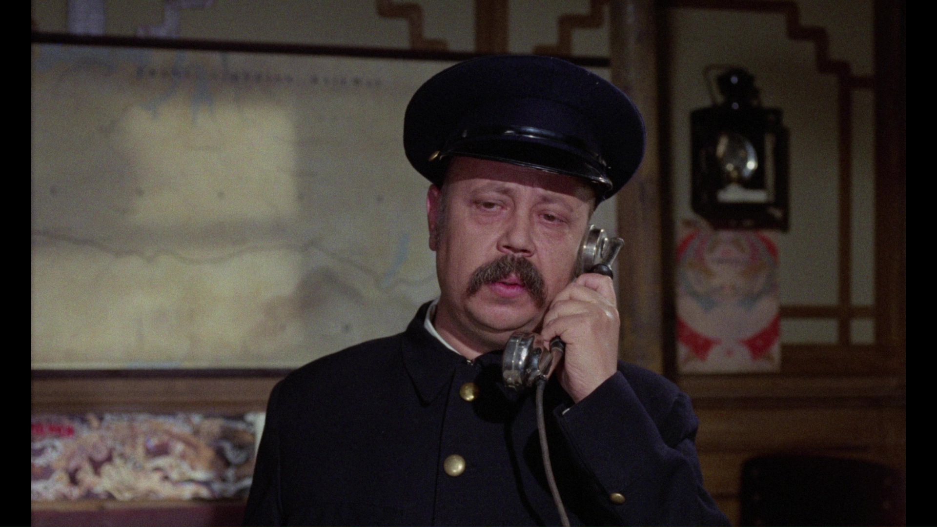 In 2019, Arrow Video offered the film with its first fresh scan in several years, and the difference is quite a significant improvement with much finer film grain, added detail, and a more natural color shift away from the orange cast on the earlier Blu-rays (closer to the cooler look on the Image DVD). The train interiors in particular look much richer with fabrics and glass patterns registering more strongly, and the dark scenes are more atmospheric by a fair margin. (Frame grabs in the body of this review are from the Arrow; comparison ones can be seen below.) The usual English LPCM track is included here, sounding quite nice, with optional English SDH subtitles. The master for this 2K-sourced presentation features the English opening credits and Spanish ones at the end. Ported over from the Severin disc are the "Murder on the Trans-Siberian Express," "Notes from the Blacklist," and "Telly and Me" featurettes, the Alexander intro (playable before the film), and the theatrical trailer, so hold on to the older one if you still want the Cushing audio interview. A new audio commentary with Stephen Jones and Kim Newman takes an appreciative tour through the making of this film including the people behind it, the status of Spanish horror cinema at the time, the differences in Lee and Cushing's acting approaches, and the ambitious, rich nature of the film somewhat camouflaged by its most familiar English title. "Ticket to Die" with screenwriter Steve Haberman (8m31s) examines the film in the context of '70s horror films in the wake of Hammer and as part of Martin's filmography, with some fun thoughts on the contrasting functions and styles of the three leading men as well as the clever use of only two train cars for the shoot. Then filmmaker Ted Newsom turns up for "Night Train to Nowhere" (15m8s) focusing on the role of Gordon, whom he knew, including his career up to this film, the challenges of keeping Cushing involved after the death of his wife, the challenge of booking indie films, and the narrative debt to "Who Goes There?" The package also comes with a reversible sleeve featuring a new design by Graham Humphreys and, in the first pressing only, an insert booklet with liner notes by Adam Scovell.
