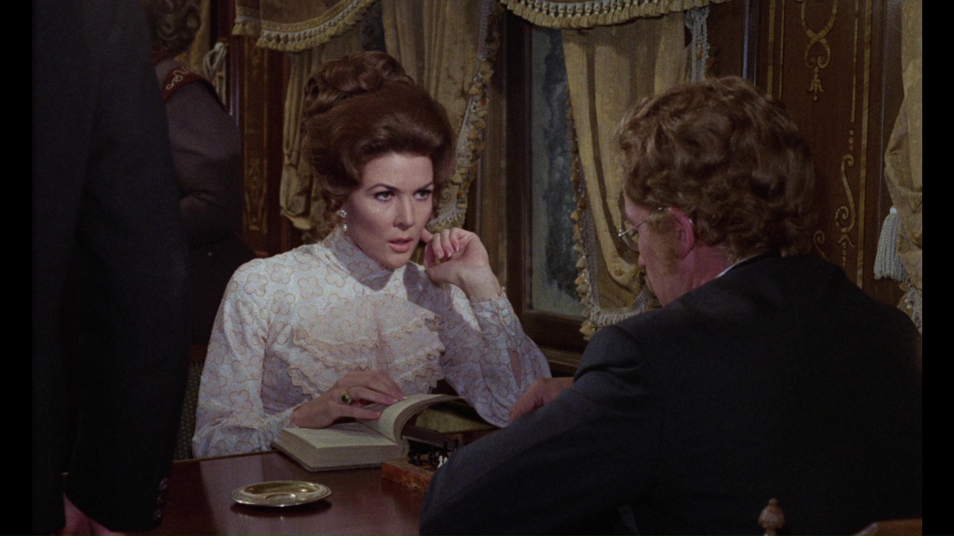 Severin's Blu-ray release in 2011 (also available on DVD in the same combo pack, but why not go for maximum clarity?). Transferred from the original Spanish negative, it doesn't appear to have undergone much processing or clean up; colors are vivid and even startling inside some of the velvety train interiors, and there's only a small amount of debris (mainly during the opening credits). The framing also looks accurate throughout. On the other hand, this was one of Severin's earlier Blu-ray efforts and suffers from some compression issues that give it a chunky, unnatural look when it comes to the grain and movement involving the actors. Interestingly, this version contains the original Spanish opening credits (not a surprise) but also contains an on-screen shot of the train before the opening credits begin, which played out in complete darkness in the American version. Even more obvious is the restoration of the original end credits, which scroll as originally intended rather than the abrupt cut to black and long musical play out from the more