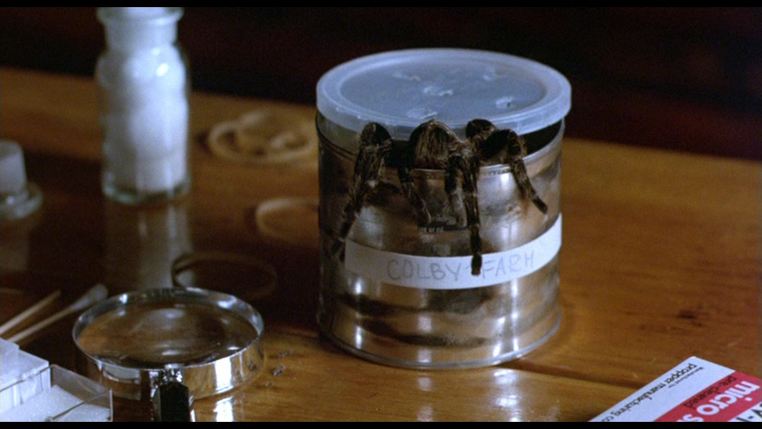 full frame transfer and zero extras. Shout! Factory stepped up with the film's first special edition in 2010 on DVD, featuring an assortment of extras partially commissioned through Code Red including a fun audio commentary with Cardos, producer Igo Kantor, spider wrangler Jim Brockett and cinematographer John Morrill, moderated by Lee Christian and Scott Spiegel. You get a lot of spider stories here of course, including notes that they did their best to not pulverize very many of them (though some get visibly run over and stomped, unfortunately), as well as tales of Shatner and Bolling working with their furry co-stars. There's also a separate Shatner interview (16m35s) that'll make you sad he never got around to doing the planned sequel, a really fun piece with Brockett and Christian (12m23s) showing off some real-life varieties of tarantulas with very different personalities, a quick chat with co-writer Stephen Lodge (4m40s), a reel of Super 8 behind-the-scenes footage (17m18s), the theatrical trailer, and a gallery including stills and pressbook material.