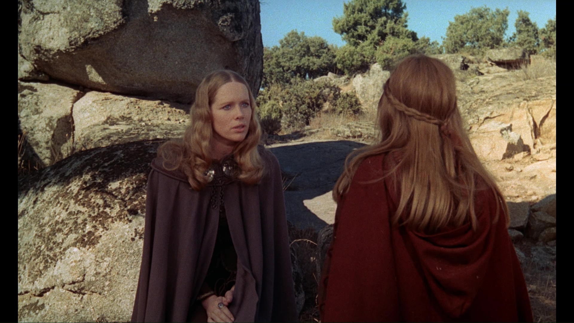 Despite its failure to set the box office on fire, Leonor was one of the earliest films released on VHS by Magnetic Video in its shortened U.S. version. After that it was usually spoken of far more often than actually seen, bypassing the main DVD era entirely apart from a so-so German release. In 2018, Scorpion Releasing revived the film on Blu-ray with a bona fide special edition that presents the feature in both its truncated U.S. cut (English dub only ) and the longer Spanish version, either in English or in Spanish with properly translated English subtitles (all DTS-HD MA mono). Since this is such an international production you'll have to put up with dubbing no matter how you see it, but the Spanish one is a more elegant and generally preferable. There are some interesting differences between the two transfers, with the U.S. cut more spaciously framed at 1.66:1 and the longer one a bit tighter at 1.78:1, the latter looking a tad warmer and sometimes darker as well. Both are perfectly pleasant watches and vastly superior to what we've had before, but it's curious to see a marked presentation contrast between them. For the record, the shorter cut basically trims down the opening third or so of the film so Ullmann gets back into the story a lot faster. The longer cut can also be played with a new audio commentary by Troy Howarth, who tackles the film from a European horror angle and makes a case for it as a significant and rewarding work featuring all of its participants at the top of their game. His admiration for the film is quite heartfelt and infectious at times, and not surprisingly he's quite infatuated with Muti, too. Incredibly random bonus trailers are included for Conduct Unbecoming, Caravan to Vaccares, Barbarosa, and The Salamander.