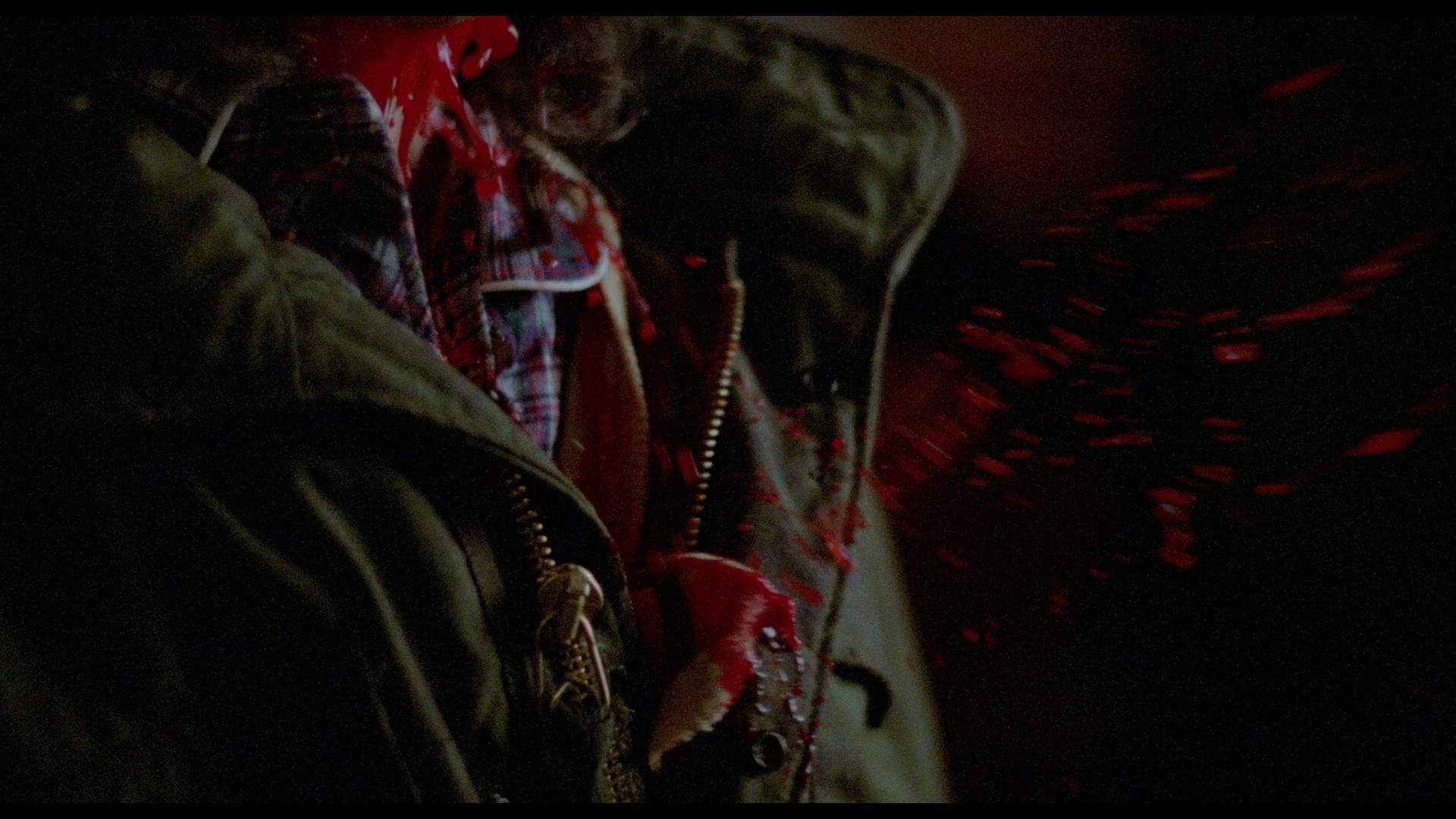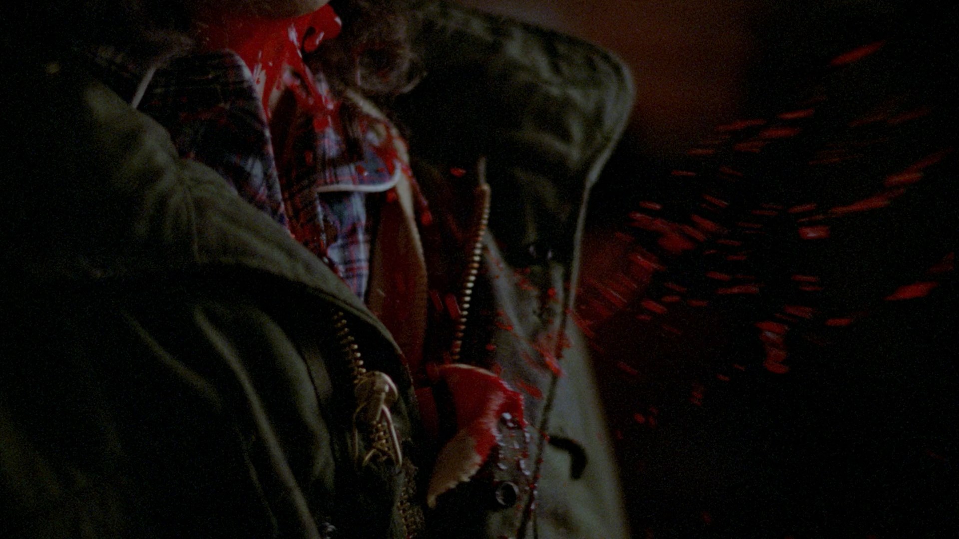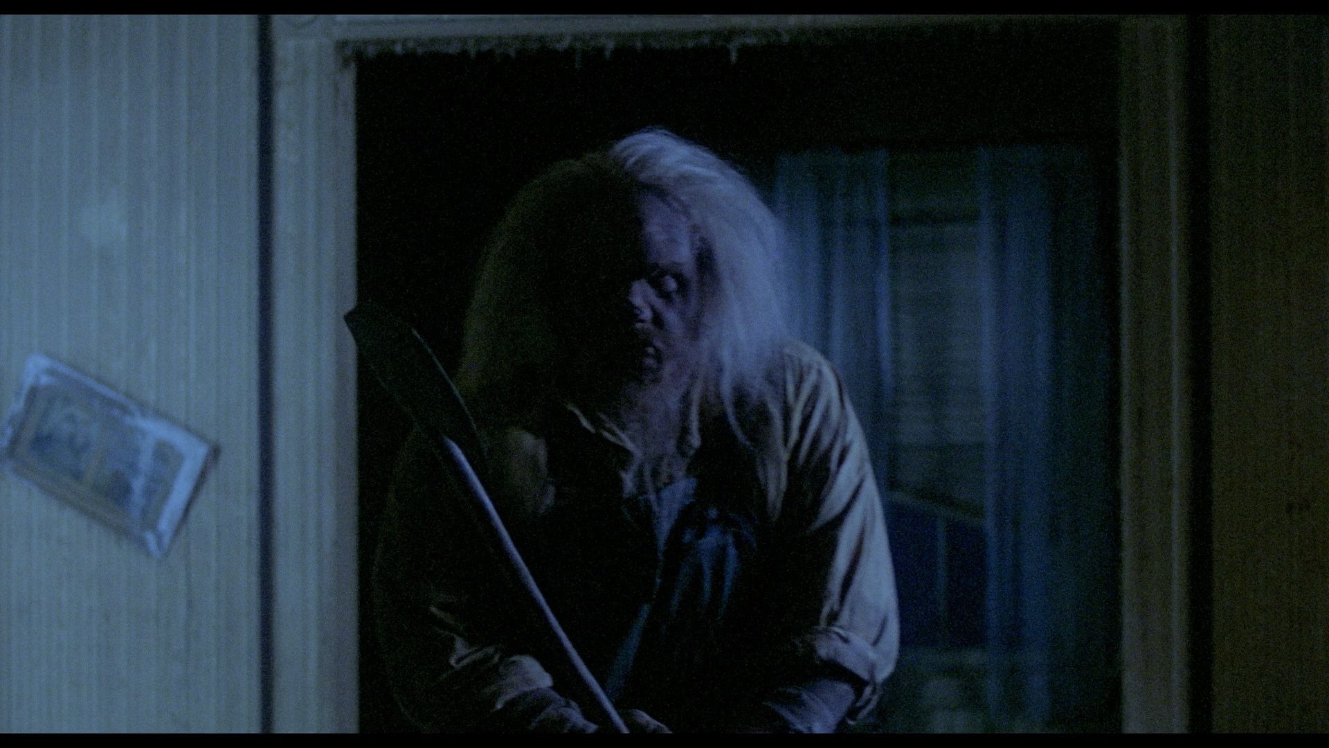 In 2015, the film revived again from Vinegar Syndrome courtesy of a dual-format release containing a Blu-ray and DVD featuring a new 4K HD transfer from the original negative. Of course the big question here is what the color timing is like, and it definitely veers closer to the Anchor Bay side as the blue tint is now back for the night exterior scenes and flashbacks. The image quality is very impressive given the modest nature of the source; the film has an intentionally shadowy look, and it actually looks even better if you knock the brightness down on your TV a couple of extra notches to get the blacks nice and deep. The fine layer of film grain here looks natural, and colors are vivid and seem to be accurate. At 88 minutes and 42 seconds, the transfer also clocks in a few seconds longer than the previous releases (88 mins., 16 sec.), which appears to be due to the more immaculate element used without the print damage seen in the past. (Those weird purple lines appearing in some shots are still there in some shots apparently due to what looks like a faulty camera.) Audio is presented in English DTS-HD MA mono with optional English subtitles and sounds great for what it is. The film can also be played with an optional new HD intro by Sales (52s) talking about his pleasure with the new HD presentation. On the audio side the previous commentary is carried over, while a new commentary is added with the gang from The Hysteria Continues podcast (two of them under the weather but soldiering along admirably) with an additional guest, Johnny Krueg, who has since passed away. They're all in very familiar territory here as the