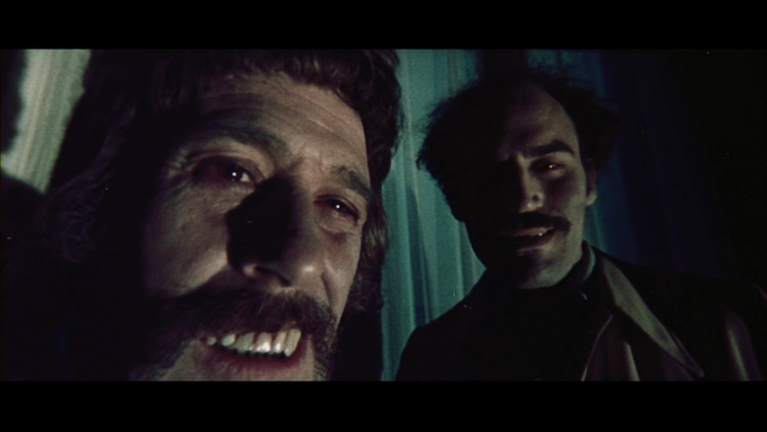Fortunately after a long, long absence from public availability, the racier unclothed version of The Vampires' Night Orgy resurfaced in a 2013 DVD release from Code Red, sold directly through their site. Obviously it's a much better transfer than the haggard VHS-era one (now long unavailable) from Sinister Cinema, and it's interesting to note here that pretty much all the nude scenes appear to be contained within the same reel. A nice cost-saving trick if you need appease the local censors and swap it out in a hurry. The source print has obviously been through a few projectors as there's a fair amount of damage, while the colors are better than before but still look weird and sickly. (That could be how it was shot, tho