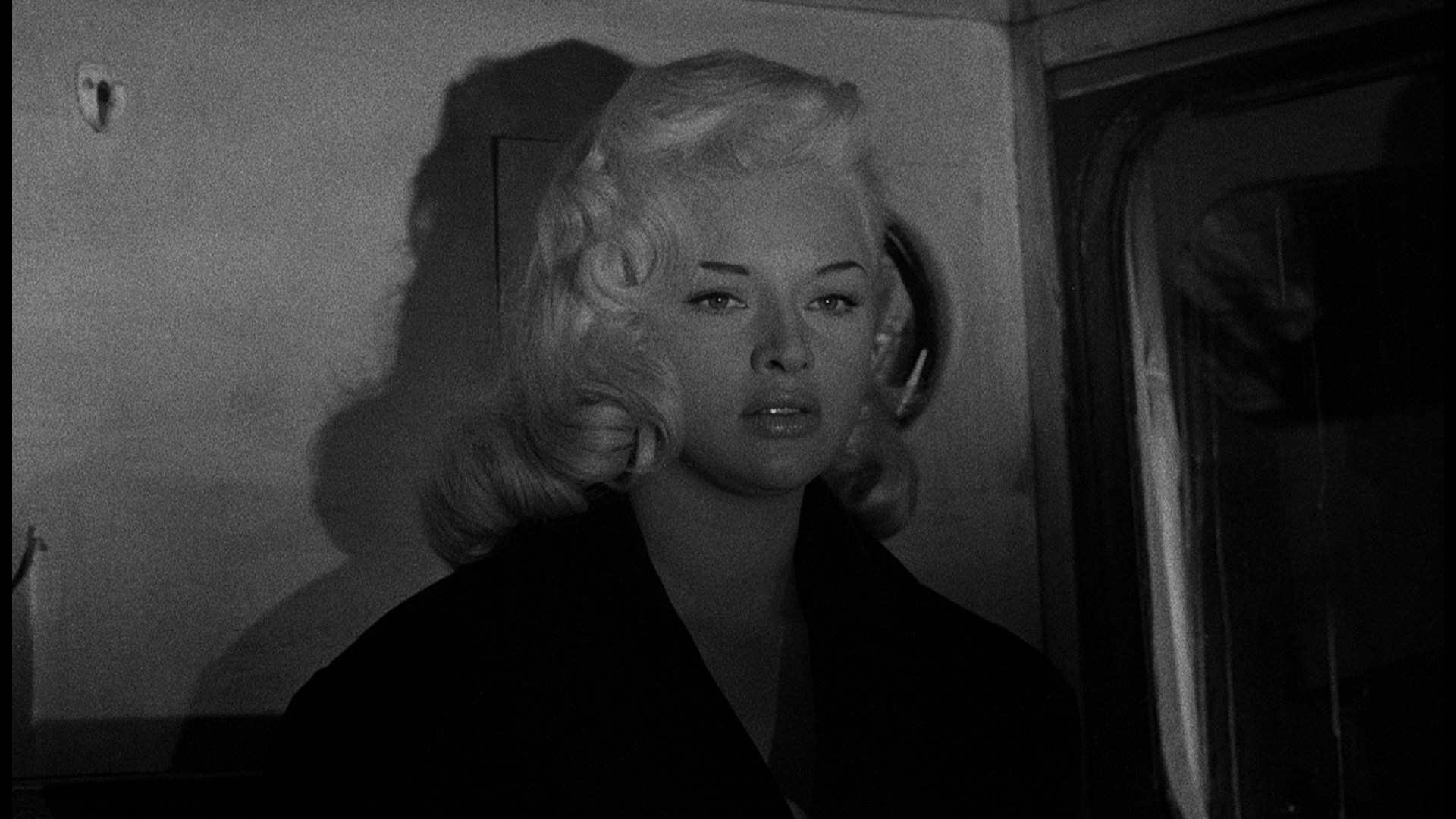 Then we go truckin' on disc five with The Long Haul, another one previously on U.S. Blu-ray -- in this case on a disc with The Shadow on the Window and Pick-up Alley as part of the Kit Parker and Mill Creek Noir Archive Volume 3: 1957-1960 set in 2019. Here the American headliner is Victor Mature in what feels like a film noir Brit answer to The Wages of Fear as he plays Harry Miller, an American truck driver stuck in Liverpool where his wife Connie (Anderson) wants to stay. Desperate for work, he gets roped into an unscrupulous trucking ring run by mobster Joe Easy (Allen) whose voluptuous girlfriend, Lynn (Dors), seals the deal by seducing Harry. As anyone who watches '50s British crime films or comedies knows, Dors at full throttle is a wonder to behold-- and that's definitely the case here as she outshines everyone else by a mile. As part of a two-picture deal with Warwick, Mature is functional enough here