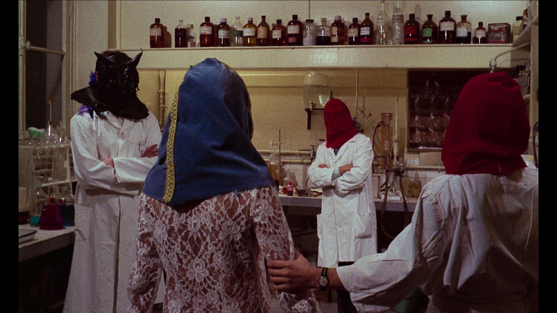 delirium of his first film, The Rape of the Vampire, director Jean Rollin returned to bloodsuckers again for a far more visually extreme variation that still stands apart from the rest of his filmography. Though his trademark obsessions with beachscapes and aesthetic nudity are still in evidence, the ultra-saturated color schemes and mad scientist motifs instead feel like some sort of unholy mash-up between Barbarella and The Diabolical Dr. Z (and almost never like a traditional horror film). The film kicks off with a group of hooded scientists doing something nefarious with their Bunsen burners and brightly-colored beakers, while others in their cult run around in animal masks and chase passing pedestrians. During all of this mayhem, young Pierre (Martin) is captivated with a scantily-clad woman (Cartier) who winds up apprehended by the sect, which turns out to be a more sinister and deadly group than they first appeared. Visitors commit suicide, blood drinking is involved, and as usual, it all winds up with haunted characters wandering a beach as their mortality comes back to bite them in the, uh, neck.
