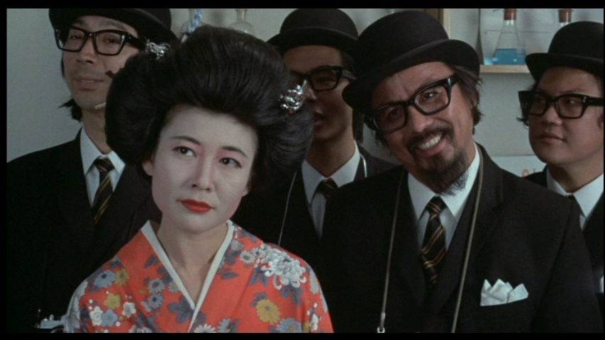 "Somewhere in England," the lovely and wealthy Utta Armitage (The Legend of the Seven Golden Vampires' Ege) is giving a press interview about some recent circumstances that have put her in the limelight along with her industrialist husband, Jeffrey (UK TV vet Sinden). Mr. Armitage has two problems: he thinks his wife's cheating on him, and several suspicious international powers are keen to get their hands on a new nerve gas he's cooked up that causes temporarily paralysis. "Famous secret agent" Madam Greenfly (You Only Live Twice's Chin) has a squad of craft Japanese spies working on prying the formula away, not to mention some Arabs who are into enslaving scantily-clad British showgirls. To solve both challenges, it's up to the detectives at Upton Security, whose head, Major Upton (The Bed Sitting Room's Fraser), sends the girl-shy Hobbs (Beckinsale) to, uh, get to the bottom of Mrs. Armitage, while the easily corrupted Hamilton (Booth) and Miles (Briers) wind up taking bribes from Greenfly on their way to protecting the nerve gas. Given the title and basic subject matter, you'd expect this to be a T&A-packed snickering sex comedy about randy young lad detectives getting into all sorts of naughty trouble. Well, there are plenty of innuendos, but this is actually less raunchy than your average Benny Hill TV episode. Ege shows off her Thanks to the strength of its cast and reasonable nostalgia value, Rentadick has stayed in circulation on video regularly in the UK (including a 2007 DVD from Network) but remains almost completely unknown in America. The 2013 Scorpion release will be a first time experience for many viewers, who should get a kick out of its broad slapstick comedy and the ridiculous barrage of non-PC treatment of minorities, who are so exaggerated here one has to wonder whether anyone was offended back in '72. The picture quality looks quite strong throughout, with lots of appropriately garish colors and workable compositions framed at about 1.78:1 with slight windowboxing on the top, bottom, and left sides. (Presumably this was an anamorphic transfer originally created by Rank.) You don't really get any extras directly related to the film, but it is presented as part of the label's "Kat Skratch Action Cinema" line with hostess Katarina Leigh Waters pulling double duty here both as herself, firing off the usual rounds of trivia about the cast and crew, and her deranged French twin sister, who hijacks the wraparounds while dressed up in Sherlock Holmes drag. Stay tuned after the film for a particularly bizarre (and funny) payoff for fans of her other "Nightmare Theater" line, too. Also included are additional trailers for other Scorpion titles like Quest for Love, Kill and Kill Again, Tomboy, The Pom Pom Girls, Joysticks, Alley Cat, Voyager, and The Internecine Project.
