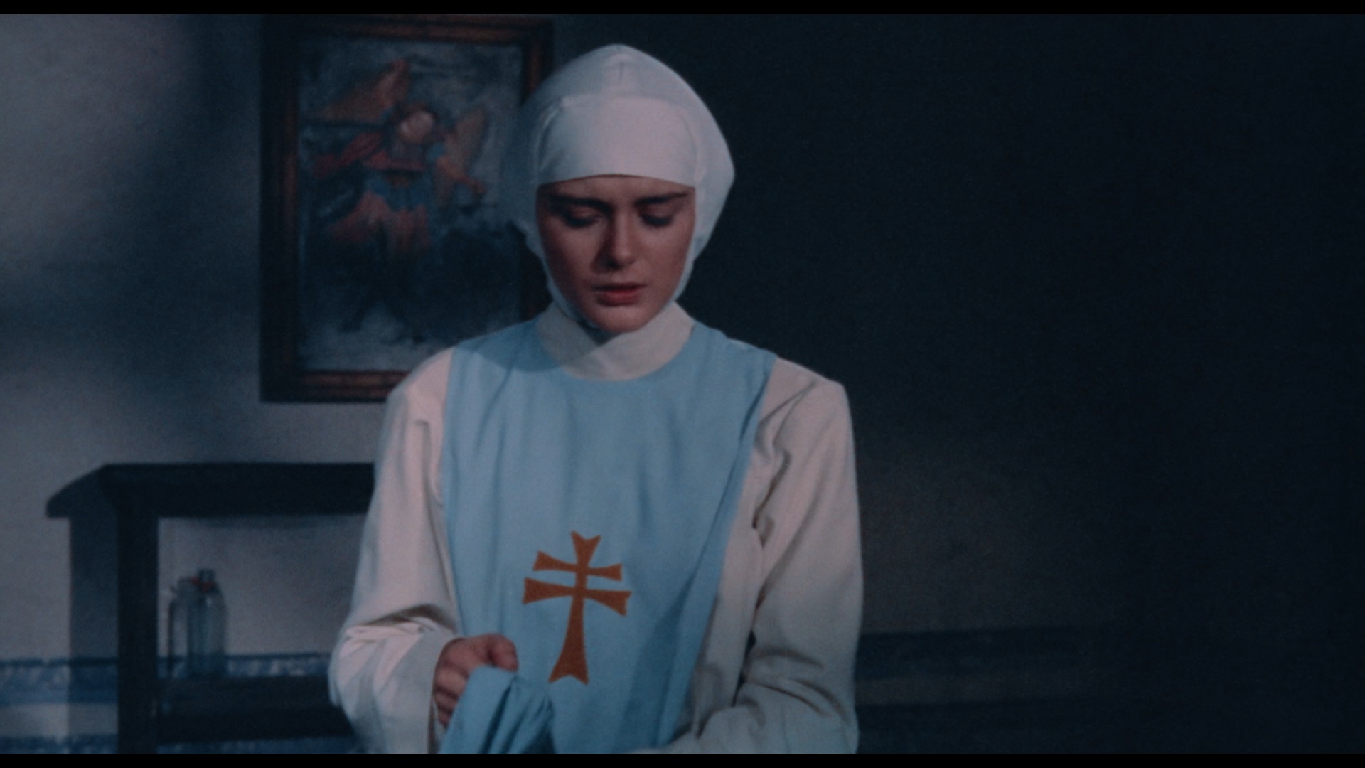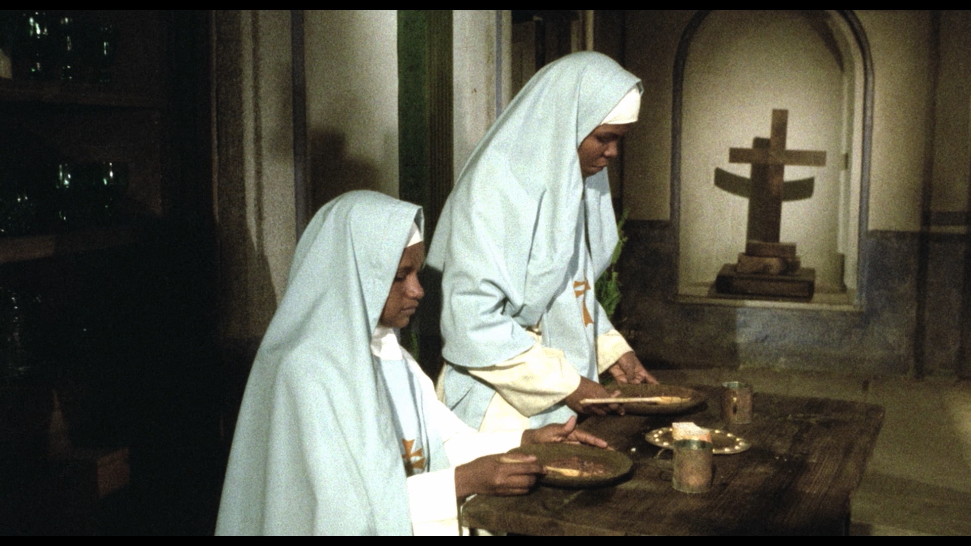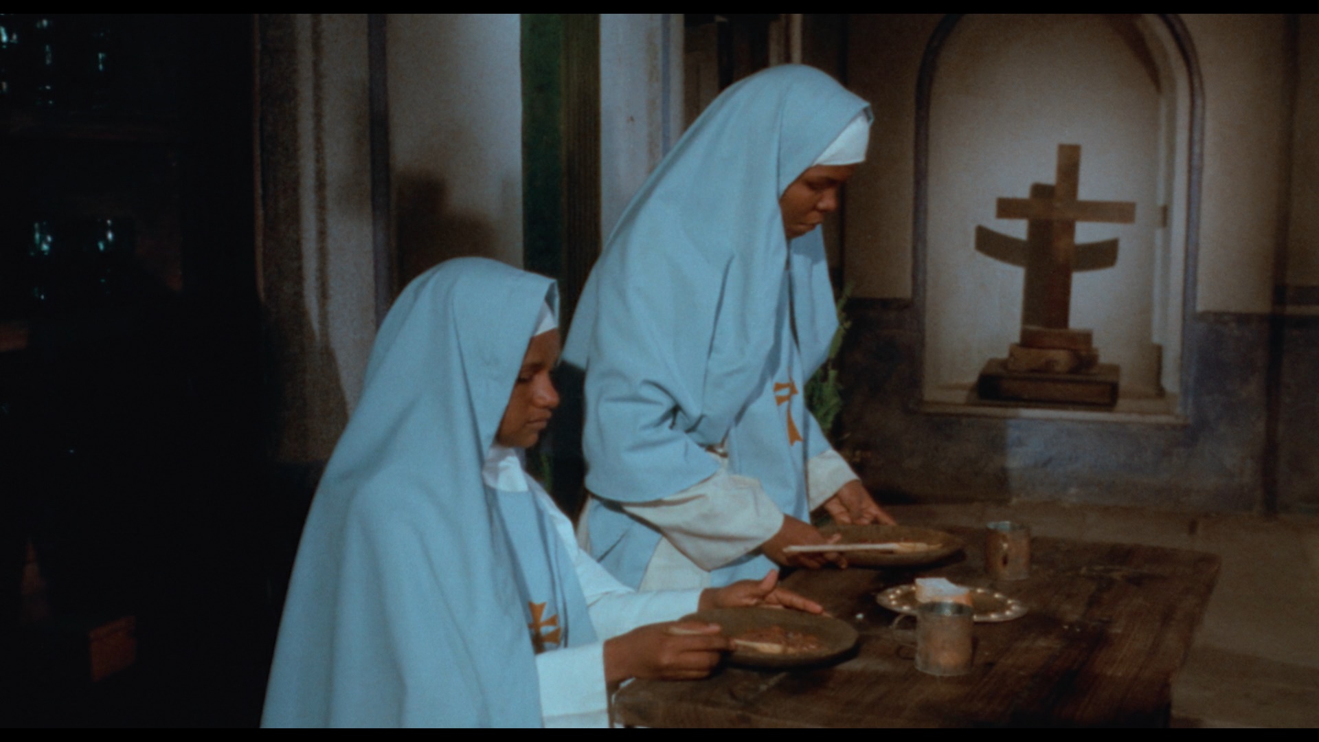 on and mostly off over the years in between) with a choice of two viewing options. The first is a fresh scan of what is referred to as "pre-print materials" on the menu but advertised as a new 4K scan of the negative. In any case, it looks excellent with nicely saturated color and the most detail by far of any available option. However, as the menu notes, it has an intermittent "optical fault" that was not fixable and so a separate scan of a theatrical print was commissioned. The latter looks, well, like a print with a grainier appearance and less impressive color; it may be more technically faultless but really the first option is better and any imperfections are minor enough. The DTS-HD MA Spanish audio is in solid condition throughout and comes with optional English subtitles. Both prior featurettes are carried over here, plus the usual Mondo Macabro promo reel, but there's also a new audio commentary by Diabolique's Kat Ellinger and Samm Deighan; anyone familiar with their past collaborations should know that they have a great rapport together and have an infectious glee that's present here as well. As they note from the outset there's very little tangible production material out there about this film, so instead they take the critical reading approach to contextualize this in the grander scheme of Mexican horror, nunsploitation, Satanic cinema, and much more.