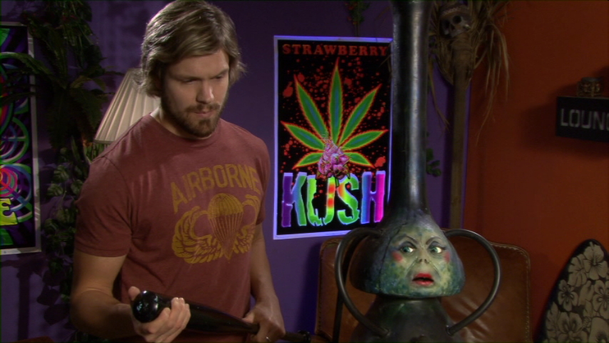 Speaking of monsters and potheads, that can only lead us now to Full Moon territory with Evil Bong 3: The Wrath of Bong. A crazed, colorful entry in one of the company's more popular recent efforts, this one ratchets up the psychedelic colors and random goofiness for the tale of four head shop owners in Venice Beach, including the survivors of the first two films. However, a monstrous bong from outer space lands nearby and starts to entrap them in an alternate universe filled with topless space pot babes, leaving them no choice but to enlist the original Evil Bong to help them save the world. Director Charles Band ladles on the fantasy sequences and stoner comedy with a shovel, and this was originally presented in 3D as well along with a revamped version of John Waters' Odorama. (Dare we hope for a 3D Blu-Ray down the road?) The film itself is almost incidental at this point as the whole project is basically one giant goofy gimmick with a toy tie-in, but fan favorite bong Eebee is fun to watch as usual, and for those keeping track of his wacko career, Shortbus alumnus turned Troma and gay TV vampire actor Peter Stickles turns up as a buttoned-down geek lured into the alien bong universe. Not surprisingly, the DVD is outrageously colorful and also comes with a caffeinated trailer that'll give you a contact high.