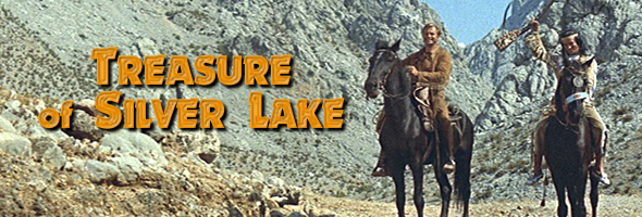 The most widely acclaimed and commercially successful film in the series is Treasure of Silver Lake, released in Germany as Der Schatz im Silbersee. Former Tarzan actor Lex Barker made his debut here as Shatterhand (a role he reprised six more times) as did his co-star, Pierre Brice, who went on to play Winnetou in even more films for both the big screen and television. Shot in Germany and Croatia, it's a standard revenge story amped up to operatic degrees as young, handsome and headstrong Fred (George) sets out for vengeance against the bandits who killed his father to obtain half of a valuable treasure map. The leader of the killers, the seemingly respectable Colonel Brinkley (Asylum's Lom), now has his sights on obtaining the other half of the map and snatches up the beautiful Ellen (You Only Live Twice's Dor) to get the job done. Meanwhile, after brawling in a case of mistaken identity, Fred teams up with the stoic Old Shatterhand and Winnetou to navigate a treacherous terrain of Indians and natural perils before confronting the evil colonel at the site of the treasure itself.