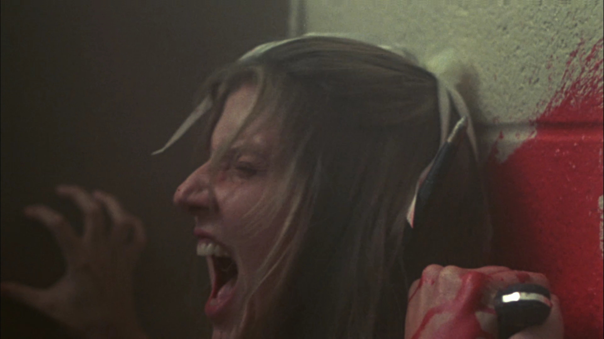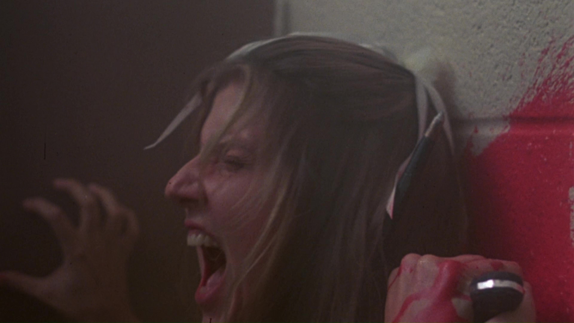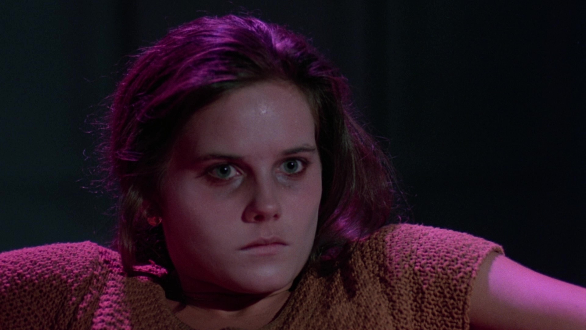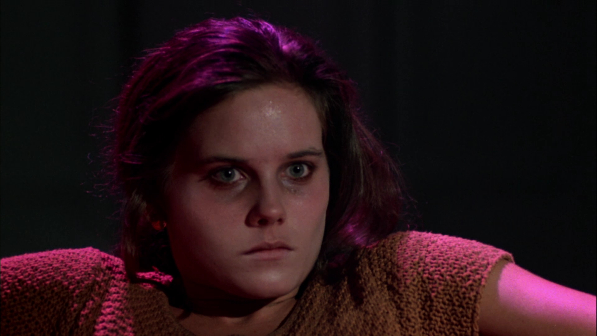 However, that first Blu-ray didn't stick around too long, and Scorpion decided to give it a second visit in 2018 with a fresh transfer from the film's internegative, a restrained and much more faithful new 5.1 mix built from the three-track original magnetic audio elements, and for the first time, all of the substantial extras gathered together on one disc. The new transfer modulates the color timing a bit more carefully to tone down some blown-out whites and looks a bit more coherent in the darker scenes, with the heavy reliance of violet and pink lighting still left intact. The night scenes are also cooler in terms of color temperature. (Frame grabs in the body of this review are from the 2018 Blu-ray, with comparison ones below.) The DTS-HD MA audio options include the aforementioned 5.1 mix and 2.0 mono (with optional English subtitles), both much cleaner than the prior Blu-ray which had some audible crackling and popping at times. Audio-wise, the disc also features both of the preexisting commentaries and an isolated score track for Band's score. In addition you get the alternate ending and storyboard comparison (cut into one 5m18s reel here), all of the video featurettes (Davidson, McNeil, Kozak, Rosman, Kantor, and Band), the still gallery, and the trailer and TV spots. The Katarina's Nightmare Theater Mode has also been restore with the intro and outro, so no need to hang on to that DVD now at all. The reversible cover ditches the familiar U.S. romance novel-style poster design in favor of two different designs, with the reverse one utilizing a doctored image from The House That Screamed of all things. It's always great to have a vintage slasher favorite in HD, and this is obviously an essential one to add to your collection.