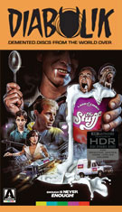 Boulevard Entertainment). The same Arrow edition (Blu-ray only, since a budget DVD edition was still out from Image) made it to U.S. shores in 2016, sporting the same transfer and extras -- and it's a winner either way. The HD transfer looks fantastic with the bold, often glowing color coming through perfectly and the hazy, distinctive '80s film stock texture remaining intact. There's also a huge amount of extra visual information visible here compared to past releases. The LPCM English 1.0 audio sounds excellent, with optional English subtitles provided. Instead of the commentary you get the trailer in its original version and with Darren Bousman commentary for Trailers from Hell, and most substantially, "Can't Get Enough of The Stuff." Running 52m9s, it's a lengthy look at the production of the film (sometimes reiterating stories from the commentary) with Cohen, Marcovicci, producer Paul Kurta, makeup effects artist Steve Neill, and Kim Newman offering an account of its unique charm and scrappy indie creation. The packaging features an essay by Joel Harley focusing on the film's place in Cohen's often satirical filmography.