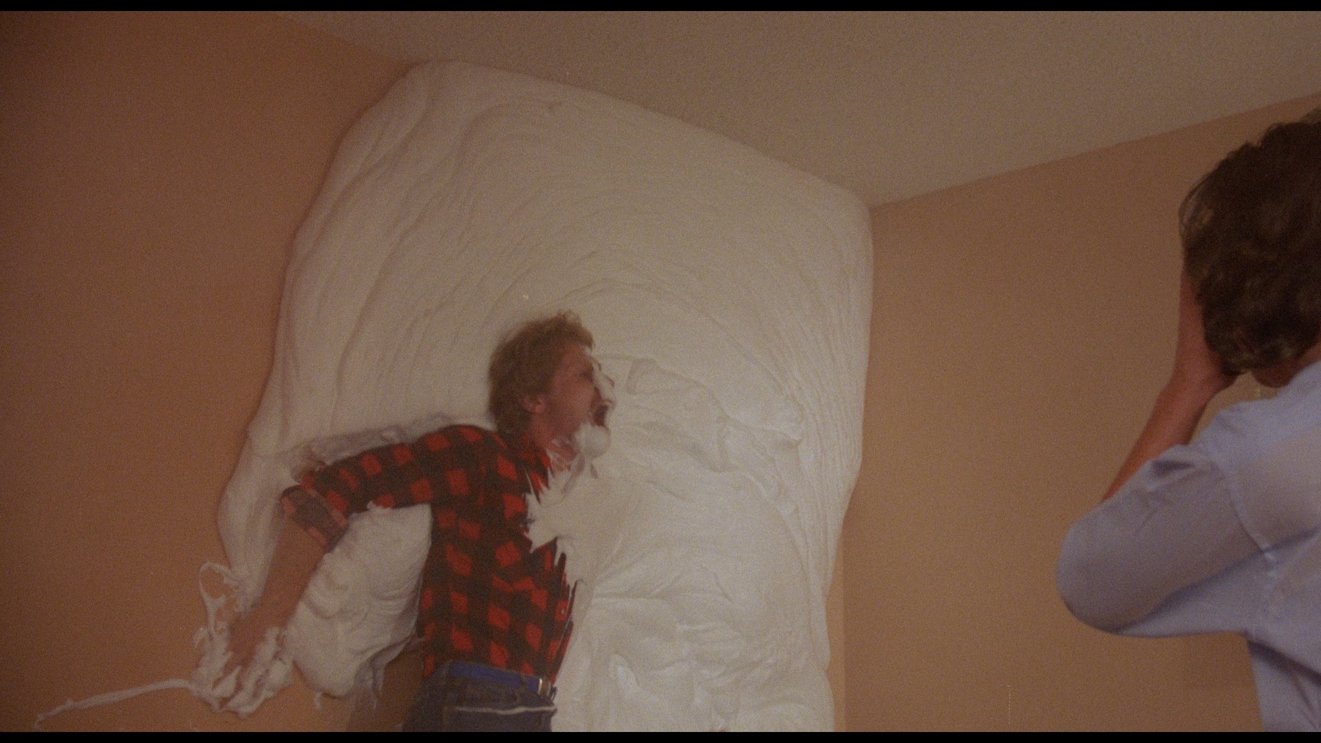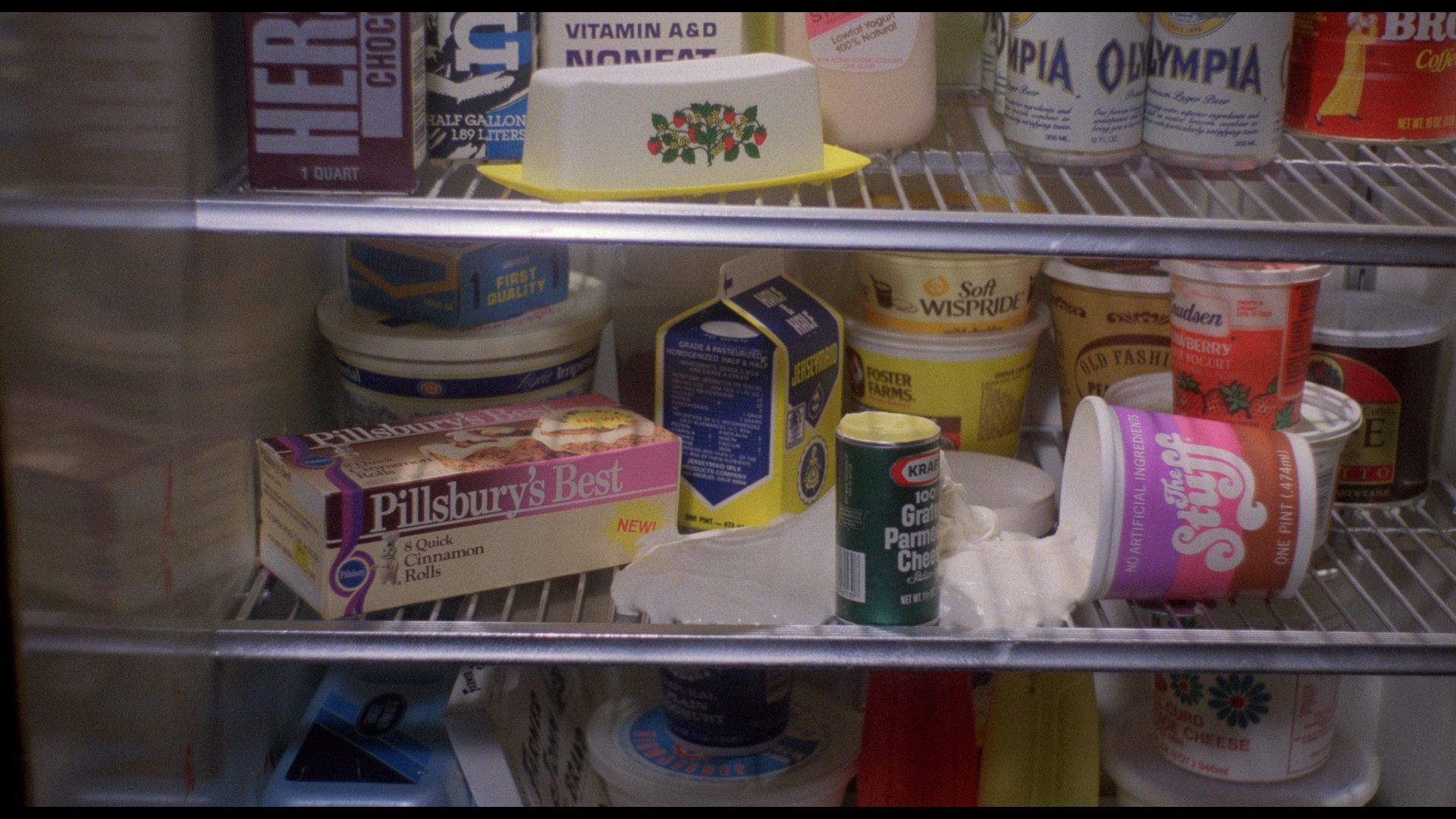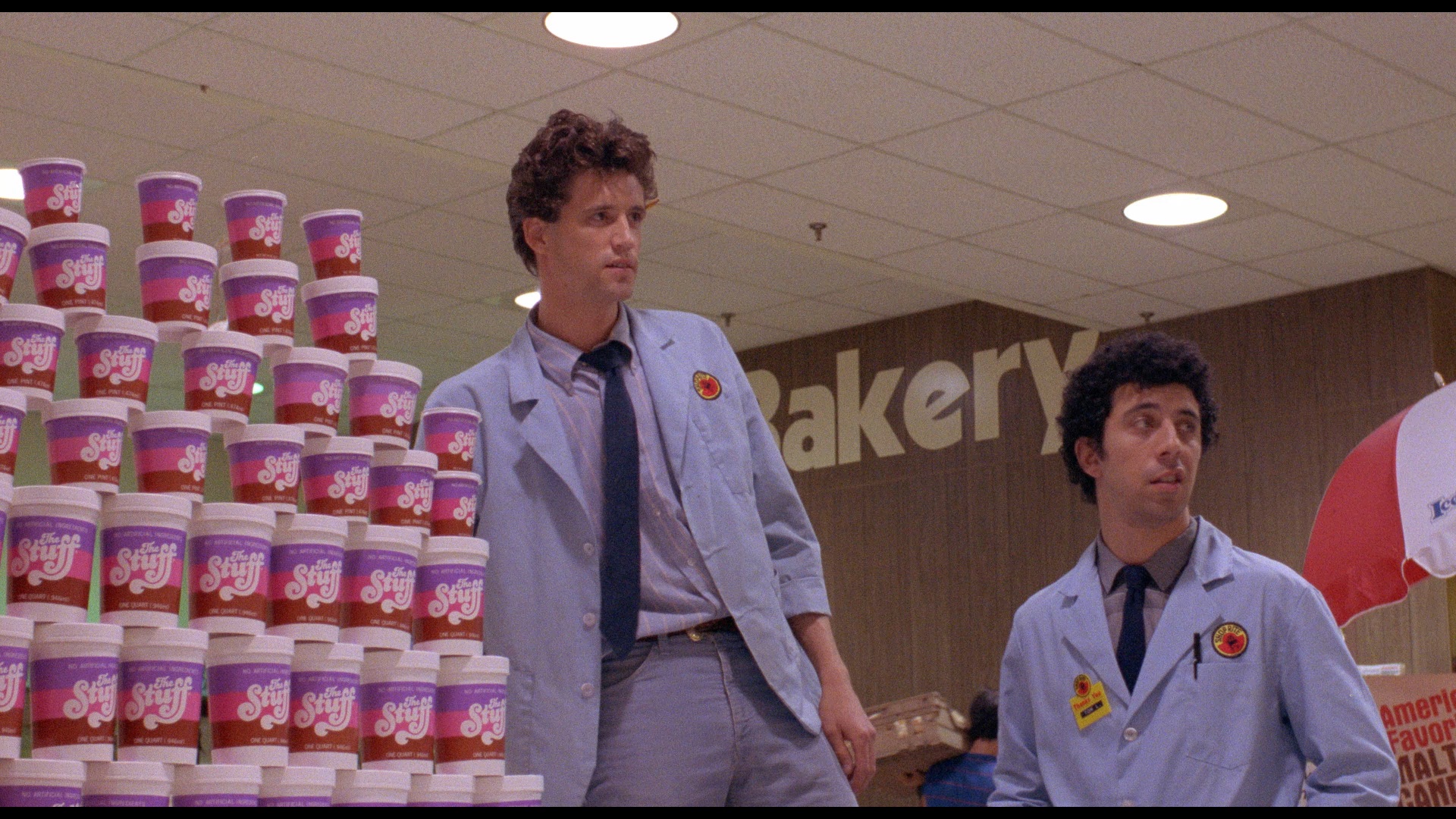 In 2025, Arrow revisited The Stuff as a two-disc edition featuring a UHD with a HDR10-compatible Dolby Vision grade for the new restoration from the original camera negative. As you would expect, it looks quite stunning with those very '80s neon colors popping off the screen and the detail coming through nice and clear while retaining that natural film grain we all know and love. Compared to the prior Blu-ray it looks about the same in terms of framing with similar color timing apart from being a notch brighter and with
