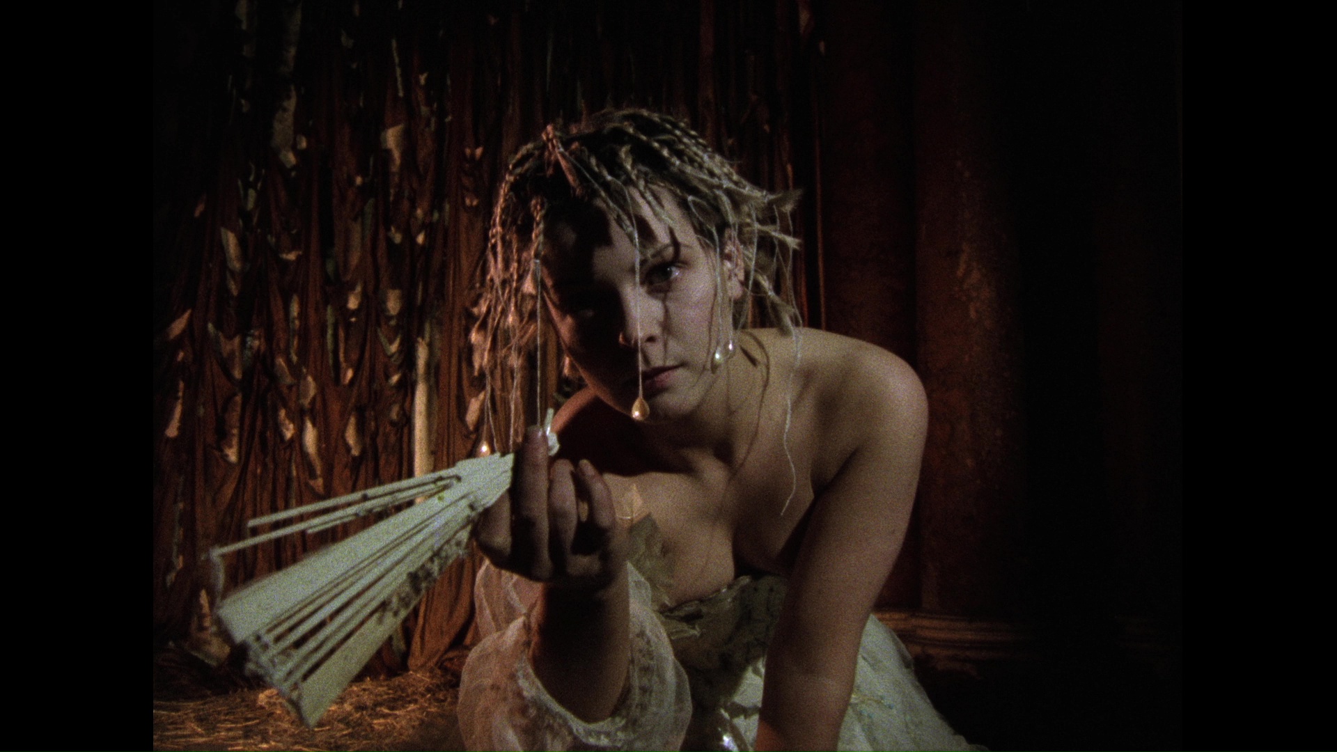 More faithful to its source than you might imagine given that it was shot for little money at Stoneleigh Abbey, The Tempest has many of Jarman's usual visual flourishes but mostly employs them in service to the story. The first half has plentiful exposure of both genders (mainly Willcox and Meyer), deep chiaroscuro lighting, windswept English landscapes, and some genuinely eye-popping costumes, all of which may not be traditionally Shakespearean but still feel oddly organic to the story.