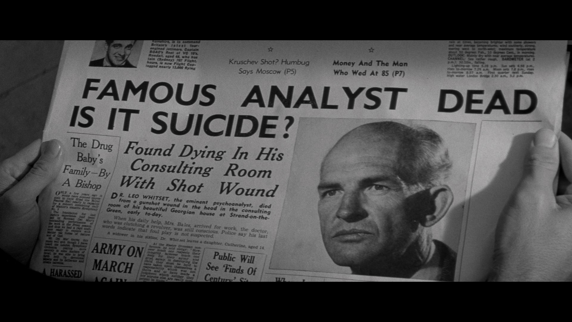 In a setup later revisited in more lurid fashion in Color of Night, a prominent London psychoanalyst, Dr. Whitset, dies under mysterious circumstances -- namely a fatal gunshot to the temple that may or may not be suicide. His final words, "Blame no one but me," lead one of his patients, American expatriate TV commentator Alex Stedman (The Man Called Noon's Boyd), to interpret the words as indicated guilt-induced foul play, a view shared by the dead man's teenage daughter, Catherine (The Innocents' Franklin). They decide to team up, with Catherine providing the names of a trio of active patients to investigate: Sir Frederick Belline (Zulu's Hawkins), a judge; art gallery manager Alfred Price-Gorham (10 Rillington Place's Attenborough); and secretary Anne Tanner (The Wicker Man's Cilento). However, as Alex digs deeper he starts to uncover secrets far more disturbing than he could have ever imagined.