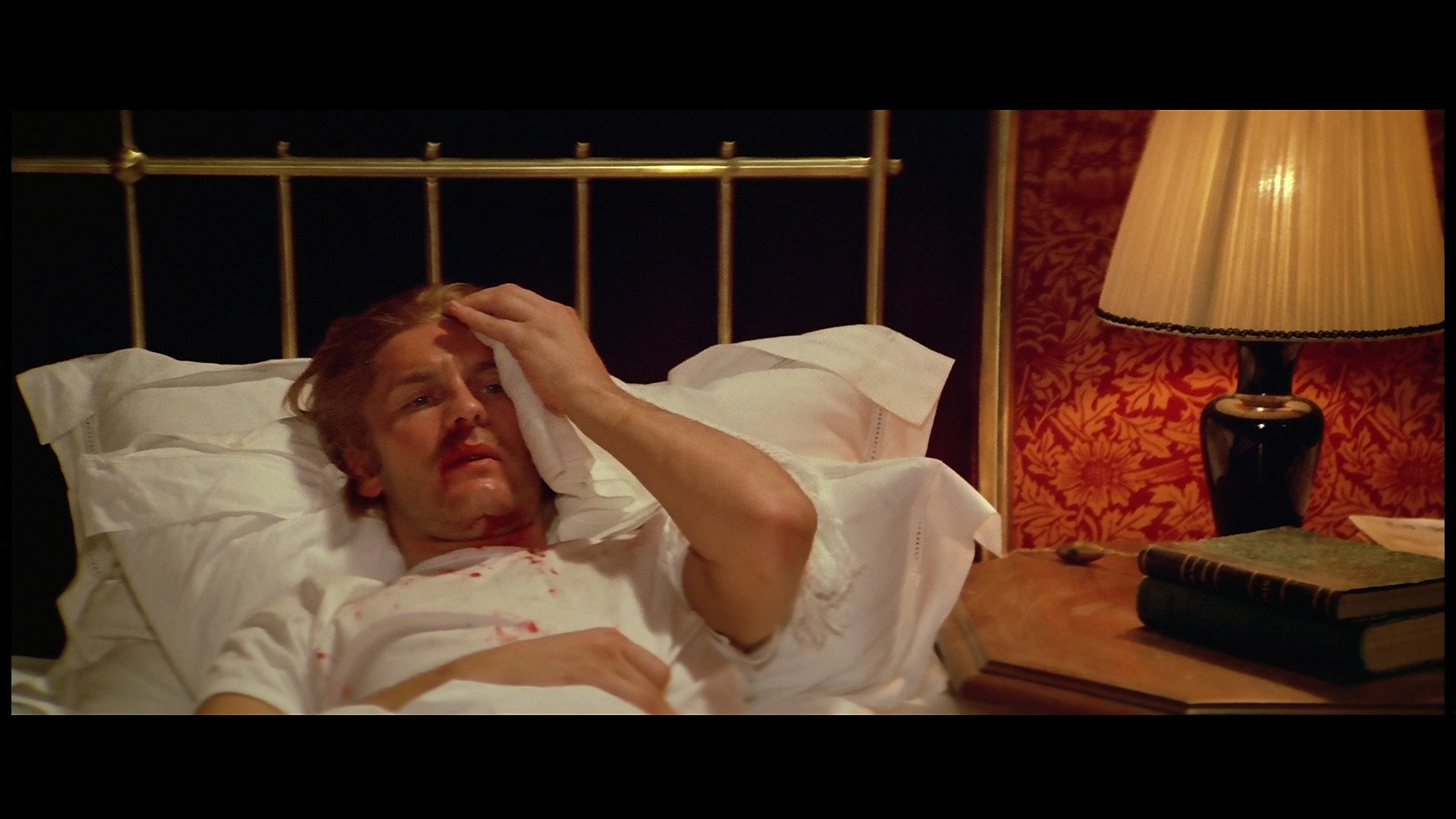 Pan and scan video transfers of this film are completely unwatchable but were pretty much all anyone had during the VHS era, but the first relief in the digital era came wtih the British DVD from Arrow. The film was shot in English (with Marsani and Patrizi later looped by other actors), though it was screened in both English and Italian versions at festivals (and, according to Raro's liner notes in their own later edition, some American theaters). For some reason Arrow's cover art devotes most of its space to a shot of Dominique Sanda, who pops up for a few seconds in a flashback as the Professor's mother; likewise, look fast for a cameo by Claudia Cardinale in another flashback as his wife. That same transfer was later used for a DVD release in Australia as well.