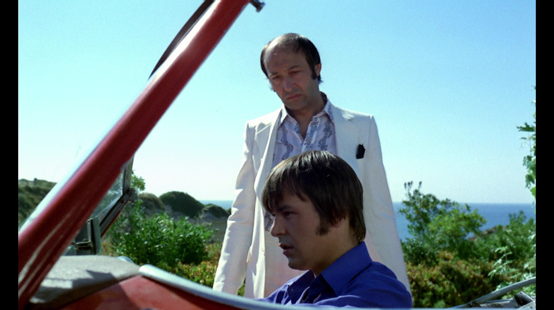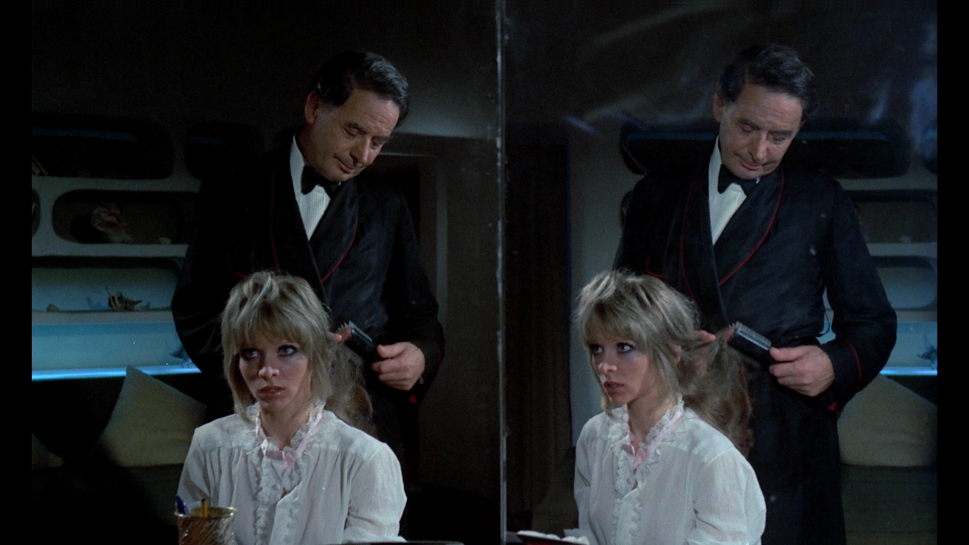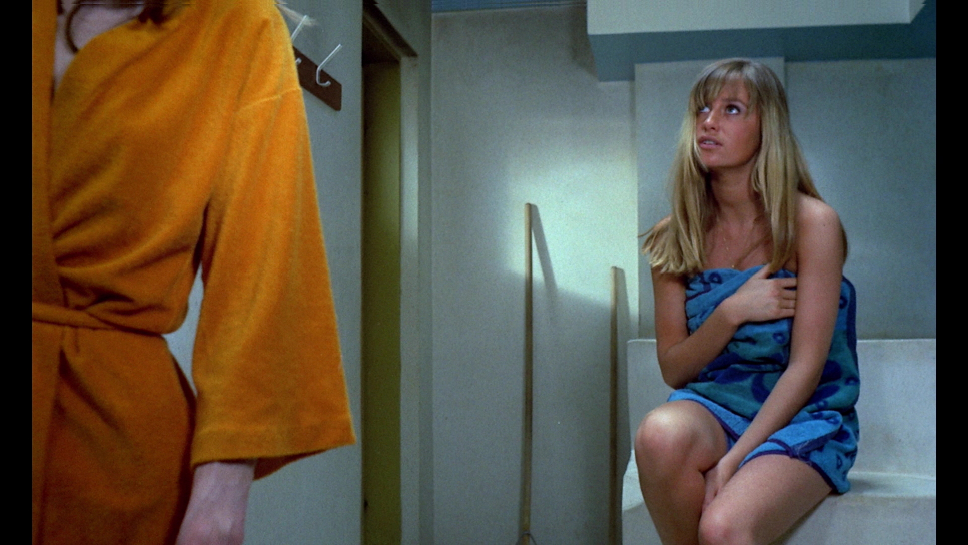 Weirdly, some early VHS versions of this film (including the most common one from Unicorn) bluntly dropped almost all of the third reel, including Sebastian's first dinner with the judge, rendering most of what follows nonsensical and barely running over 80 minutes in length. The first DVD from Image looked vastly superior and featured the complete version, as do all subsequent digital incarnations. Walker shot the film open matte, and the split screen sequence clearly indicates compositions intended to be masked at 1.66:1. The extra information also proves to be slightly distracting, as when George's bra is clearly visible while she's supposed to be taking a bubble bath. The later Media Blasters and Anchor Bay editions overcompensate by matting it to 1.78:1, which works better but looks too cramped. The Blu-Ray finally gets things right with the correct framing, and while those ultra-vivid colors have always fared pretty well, they're flat out startling here (especially George's groovy dance over the Hammond organ-fueled opening credits, one of the highlights of the film). The prior Walker/Rigby audio commentary appears here again and makes for good listening, while the new Walker interview featurette, "An Eye for Terror, Part I," has nothing to do specifically with this film but covers his general thoughts on his directorial career. Most valuable are his comments about the difficulties of the process, with each film taking five years off his life. He calls the profession a young man's game and also shares his reasons for self-financing almost all of his films; it's a nice primer and will hopefully be continued in a second Blu-Ray set, which seems likely given the title.