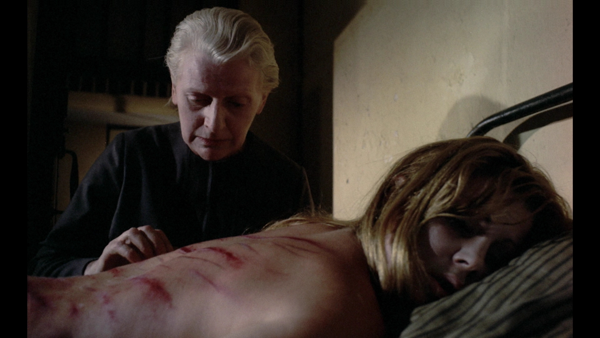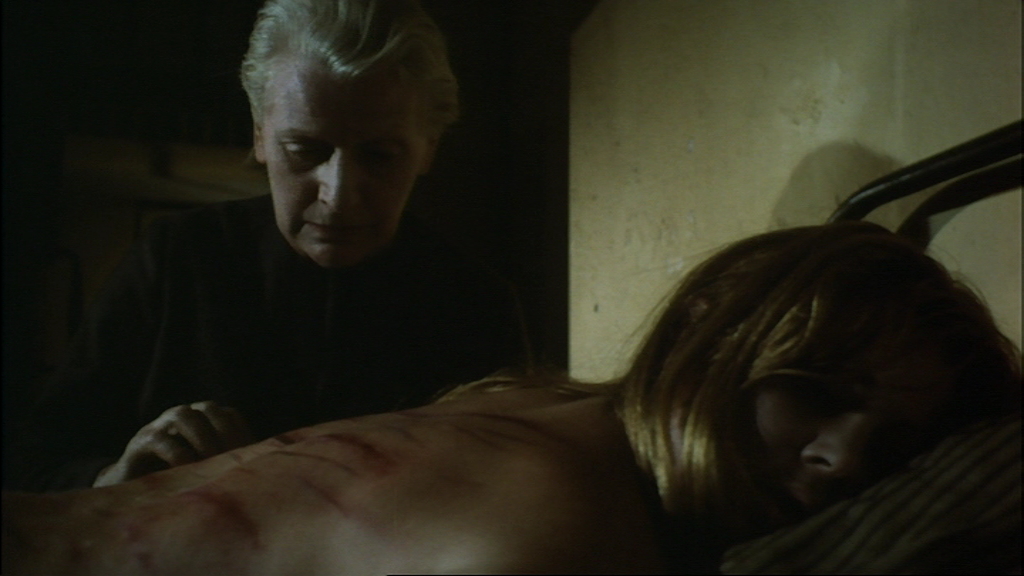 The first DVD presentation of House of Whipcord from Image was a minor step up from the incredibly murky VHS editions (released in the US by Monterey, to cite one underwhelming example) but left enormous room for improvement. The film has a tricky color scheme, with the prison sequences looking drab and sometimes very desaturated (including the opening pre-credits scene) while the cosmopolitan ones are much more vibrant and natural. An overmatted 1.78:1 transfer appeared next from Media Blasters and Anchor Bay (sourced from the same anamorphic transfer), with the latter appearing out of the gate first as part of a four-movie UK coffin set dedicated to Walker. As with many Anchor Bay UK releases of the time (including the other Walker titles), it featured the mono track along with completely superfluous fake Dolby Digital and DTS 5.1 mixes. Otherwise those two DVDs are basically the same, with a dark and often colorless look that still certainly fit the subject matter but again didn't do the film too many favors. (Click here for a sample shot from the AB/MB version, compared to the first frame grab posted above.) The 2012 Blu-Ray version is a major step up in two respects; the framing is finally presented correctly for the first time at 1.66:1, giving the film much needed breathing room on the edges but particularly at the top, while the color disparity between the two settings is much easier to appreciate thanks to a far more saturated and effective boost in both hue fidelity and detail levels. You'll still some white specks scattering around through several scenes (mainly in the first reel and a half or so), but the negative used for this transfer is easily in the best shape of any version to date. It's still not a "pretty" film by any means, but the upgrade is considerable. The audio commentary from the previous AB/MB release is carried over here, featuring Walker with director of photography Peter Jessop and Walker biographer Steven Chibnall, while a new HD interview with Walker, "Perversions of Justice," which clocks in at just under 14 minutes and offers a broader overview of the making of the film and makes a solid companion piece. In fact, all four of the Walker Blu-Rays have new video interviews by Elijah Drenner and dovetail with each other quite well. Between the commentary and featurette you get a thorough snapshot of the making of this film, which derives a great deal of tension from Walker's own relatively conservative political beliefs and his desire to make a film about persecutors whose hypocrisy is far worse than the "transgressors" they punish. His English brand of conservatism definitely worked best when mixed with McGillivray's dark and often unflinching social views, with the two best films yet to come (Frightmare and The Confessional, both of which are absent here but will hopefully appear in a second volume soon). As with the other three Blu-Rays, this also contains trailers for all of the films included except for Schizo.