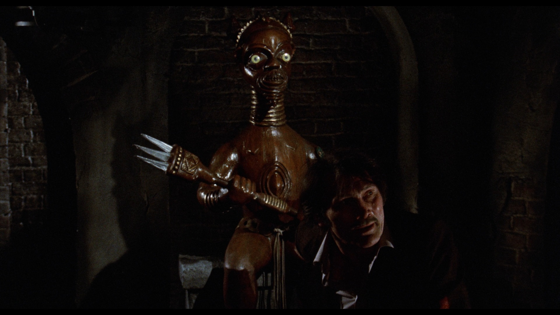 The Vinegar Syndrome disc features another beautiful 4K scan from the 35mm camera negative, which will be quite the eye opener for anyone who last caught this on VHS or its on and off streaming appearances. Ditto for the DTS-HD MA English 2.0 mono track, which sounds so much clearer than before and features English SDH subtitles. This time you get two commentaries, the first with Newman and Stephen Jones analyzing the source novel The Infernal Idol, the film's theatrical release, the backgrounds of the cast, the probability Palance's role was written for