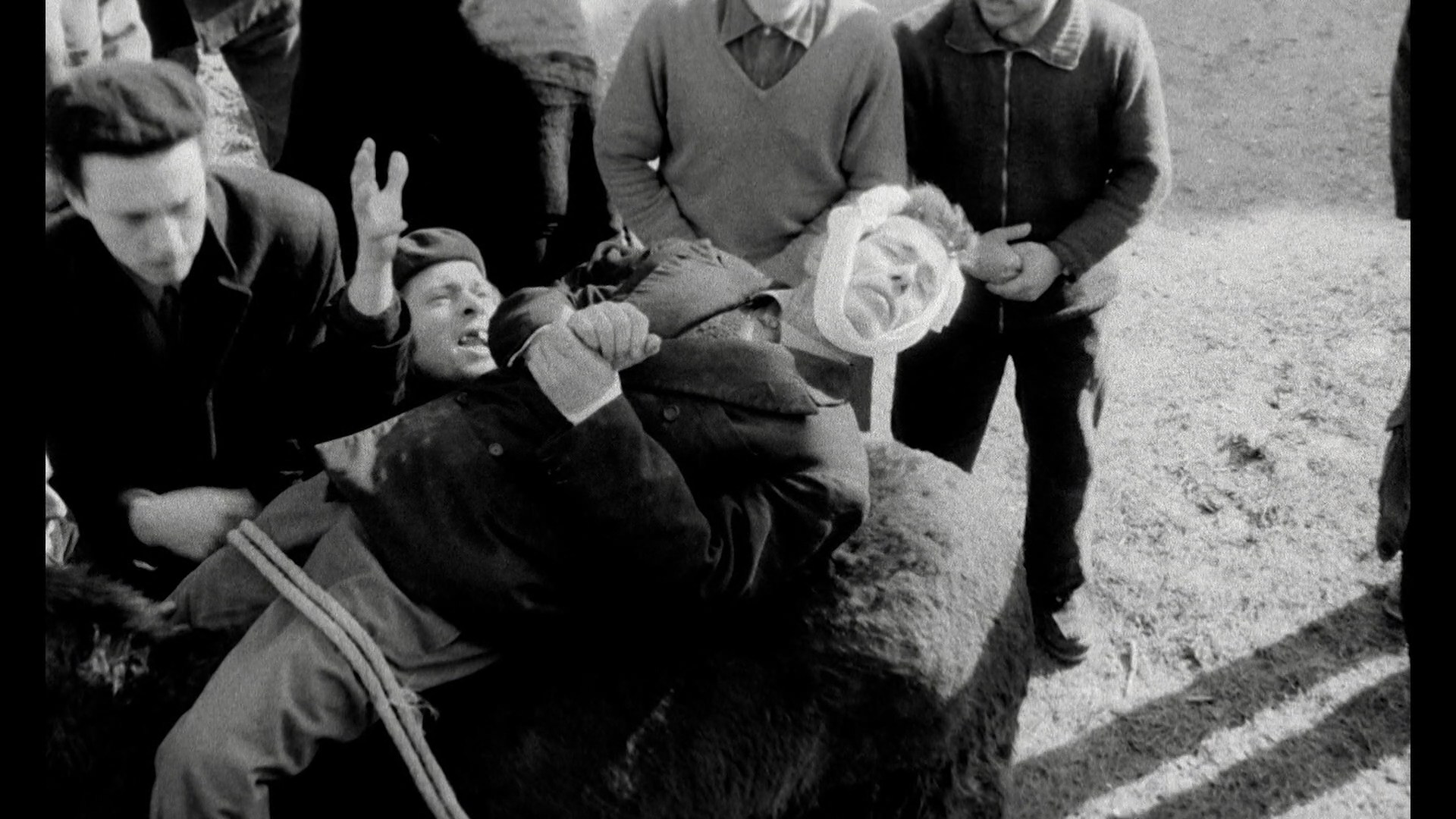 Werewolf, actor Paul Naschy and prolific director León Klimovsky turned out the peculiar and strangely haunting horror/sci-fi hybrid The People Who Own the Dark, which gets disc four all to itself. Inspired in equal parts by I Am Legend and The Day of the Triffids, it's a terrific film with Naschy actually taking on more of a supporting role here as Borne, a macho hunter type who joins a bunch of debauched upper class businessmen and their female companions for a weekend of fun and games in the countryside. That includes gathering in the basement to put on creepy pig masks and parade the women around in see-through gowns for some kind of kinky swingers' ritual, but they're cut short by an earth-rattling explosion above that sends a blind pigeon crashing to the floor. The maid shows up blind, too, with completely white eyes, and soon they realize that some kind of apocalyptic attack above ground has rendered most of the population dead or completely sightless. As the party hounds try to gather munitions, the blind locals become bent on irrational vengeance and start to gather outside the house as those inside also find their sanity beginning to break.