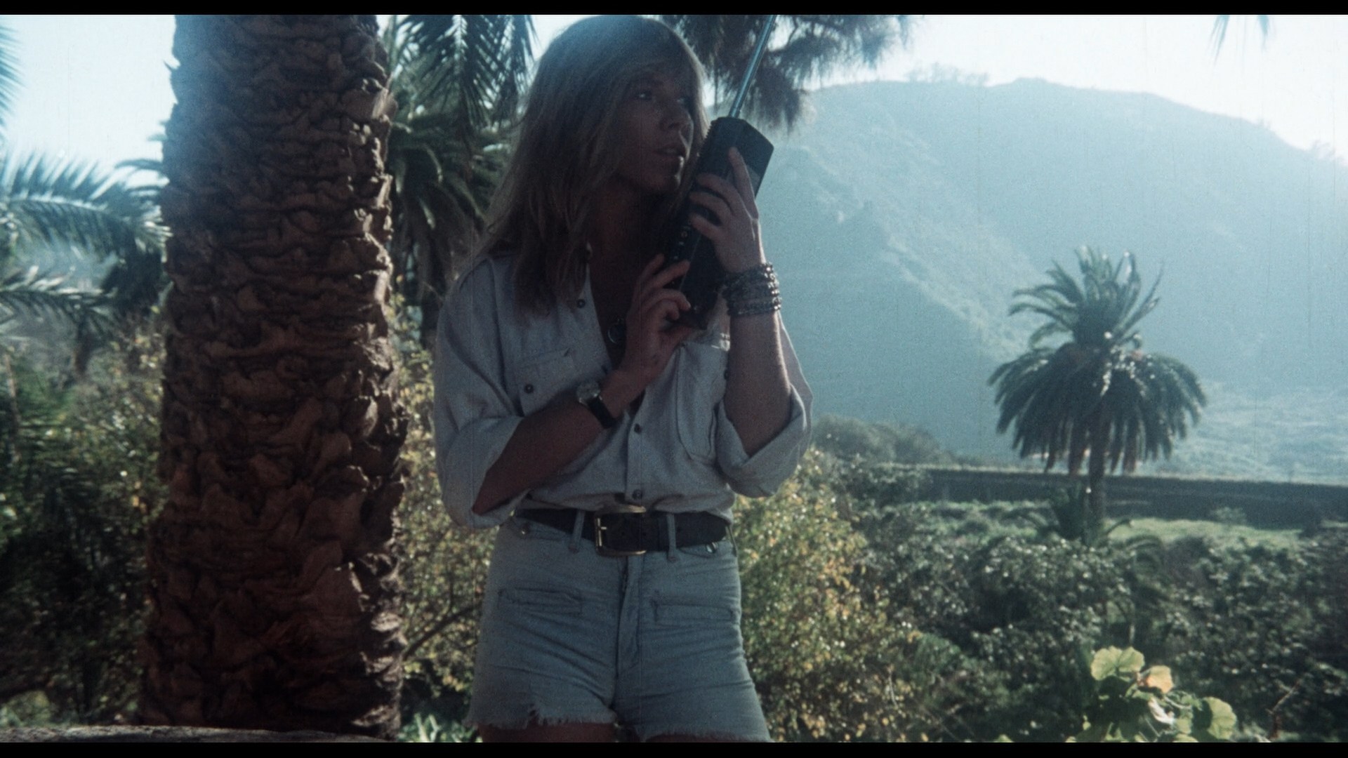 debut Blu-ray release pieces together the best existing Spanish and German prints that's a much more coherent experience than the VHS versions that once floated around (plus a bootleg DVD as The Angel and the Beasts). This one is also set on the Canary Islands and feels very Jess Franco as well (in a different way), with sexploitation director Hubert Frank (Vanessa, Melody in Love) doling out the jungle sleaze in heavy doses here. While taking a private plane ride with her married sugar daddy, danger-seeking Susi (Adriani) ends up parachuting for her life when their flight takes a dive. She ends up on a tropical island populated by Henno (Black Venus' Ceinos), Wim (Godó), Silvia (Rey), and Brit (Wondratschek),