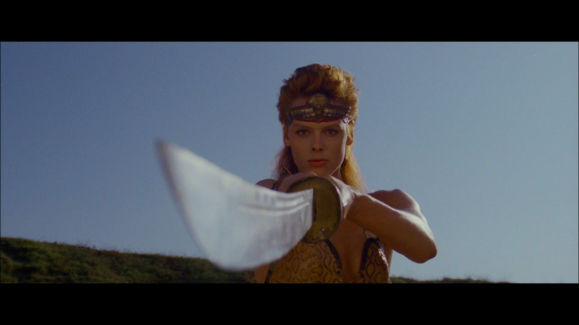 time and has been on home video numerous times including an okay Warner DVD in 2004. Pretty much everywhere else in the world, the film is controlled by StudioCanal (or whichever spelling of the company's name you prefer) who first issued it on Blu-ray in 2010 via its own name and affiliates (eventually folded into the main company) Optimum in the U.K. and Kinowelt in Germany. That release looked pretty good at the time and came with English and French 5.1 DTS-HD audio options plus German, Italian, Spanish, or Russian 2.0 mono, with Dutch, French, German, Italian, Spanish, Turkish, Danish, Norwegian, Swedish, Finnish, or Russian subtitles. The film was mixed and released theatrically in mono for some reason, but the 5.1 remix sounds okay even if Morricone's rather thin-sounding score doesn't particularly lend itself to having lots of reverb added on. Also featured on the disc are a trailer and "Arnold Schwarzenegger: The Man Who Raised Hollywood" (15m39s), an okay featurette on Schwarzenegger’s early career with colleagues like Peter Hyams, Arthur Allan Seidelman, Edward Pressman, Michel Ferry (an assistant director on Red Sonja), and others chatting about the star's career from Pumping Iron onward. Then Ferry turns up solo for "Red Sonja vs. Kalidor: The making of a Misunderstanding" (12m3s) an archive interview with assistant director Michel Ferry about De Laurentiis' technical prep for the film and the complications of making a Conan film where you couldn't use the character's name.
