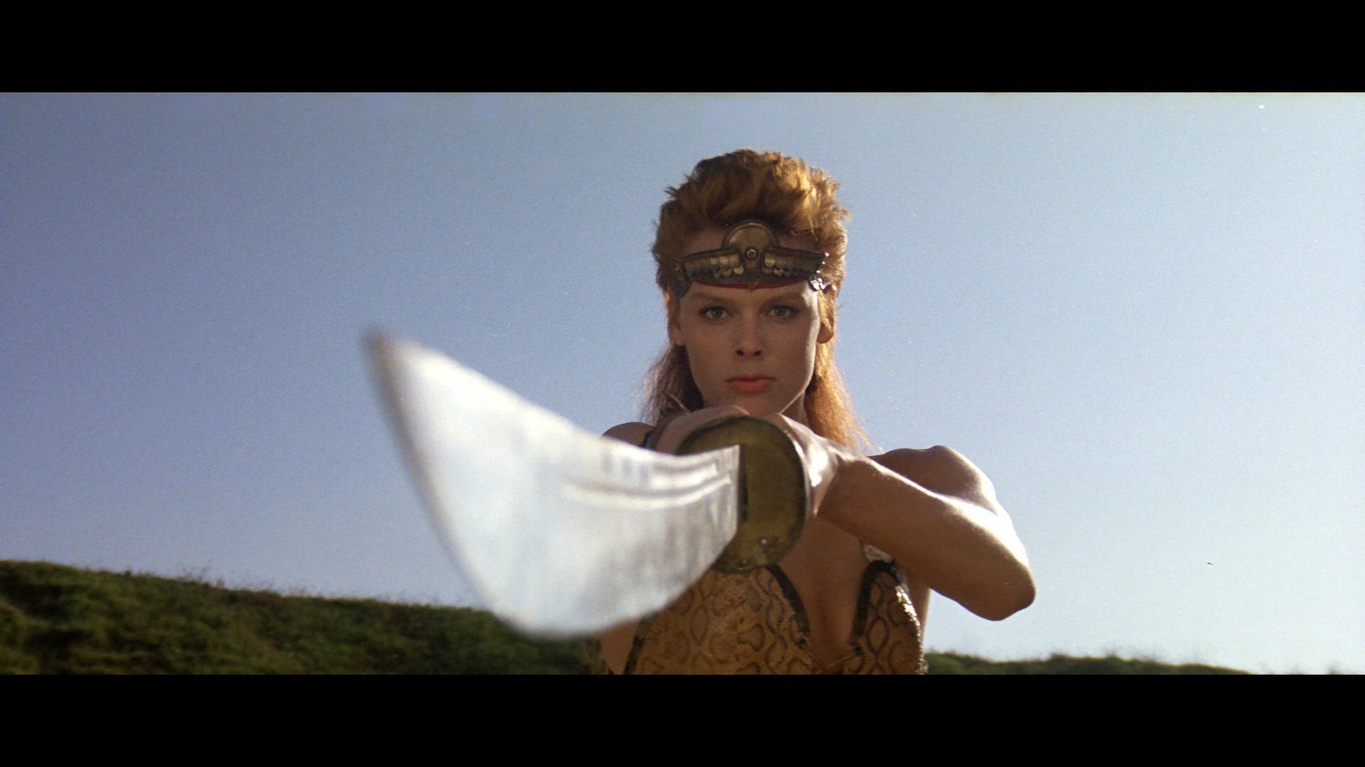 1982 and particularly gained traction in Italy was already slowing down considerably three years later with films like Ladyhawke, Legend, and The Black Cauldron proving to be less than blockbuster hits (though all have big cult followings now). To that list you can add Red Sonja, an attempt by producer Dino De Laurentiis to continue the cycle he had begun with Conan the Barbarian and its lighter, more family-friendly sequel, 1984's Conan the Destroyer from director Richard Fleischer. De Laurentiis managed to wrangle back star Arnold Schwarzenegger again for a character called Lord Kaligor here but otherwise the same as Conan in pretty much every way, with his name changed due to rights issues. The title character in Red Sonja is credited here to Conan writer Robert E. Howard and his Red Sonja of Rogatino, though it's far more closely based on the chain-mail bikini-wearing Marvel Comics character (using the current spelling and initially a spin-off from Marvel's Conan comics) whose publishing run initiated by creators Roy Thomas and Barry Windsor-Smith ended a year after this film.
