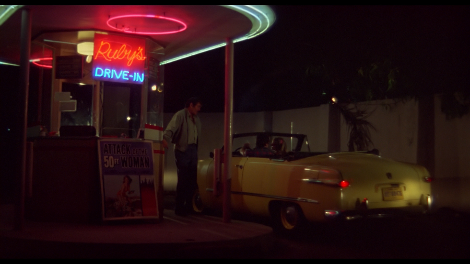 quality bumping up quite visibly including more natural fleshtones, better detail, and far more legibility in the night scenes. The aesthetic here is very filtered and deliberately soft for the majority of the running time, but the UHD (with HDR10-compatible Dolby Vision) in particular looks much better than it ever has before outside of a first-run screening. The DTS-HD MA 2.0 English mono track sounds great given the very straightforward nature of the original mix, and optional English SDH subtitles are included. Both of the prior commentaries are included, but you also get a new one with David Del Valle and David DeCoteau; as anyone who's heard their previous track for Harrington's The Killing Kind can attest, they're a blast talking about the director and that's certainly the case here. Brisk and very entertaining, it's a great snapshot of Harrington, their own memories of and experiences with this film, and plenty of showbiz tangents ranging from the silly to the sad. Among the video extras, all three of the Del Valle interviews are carried over here plus the trailer; you also get a radio spot and the entire TV version in glorious VHS quality so you can remember how bad we used to have it. In the new "Keeping It Natural" (11m36s), Davis looks back at his work with Harrington starting on 1974's Killer Bees for TV (which employed Joel Schumacher early on), his typecasting as a cowboy, and his memories of this film including its box office success, his favorite moments, and the involvement of Krantz. Finally in the new "A Cinematic Summoning" (23m20s), Kim Newman traces Harrington's genre evolution for his early days working with the likes of Kenneth Anger in the underground scene through the development of his camp Hollywood sensibility that manifests throughout much of his work including this oddly effective portrait of doomed love against a moviegoing backdrop.