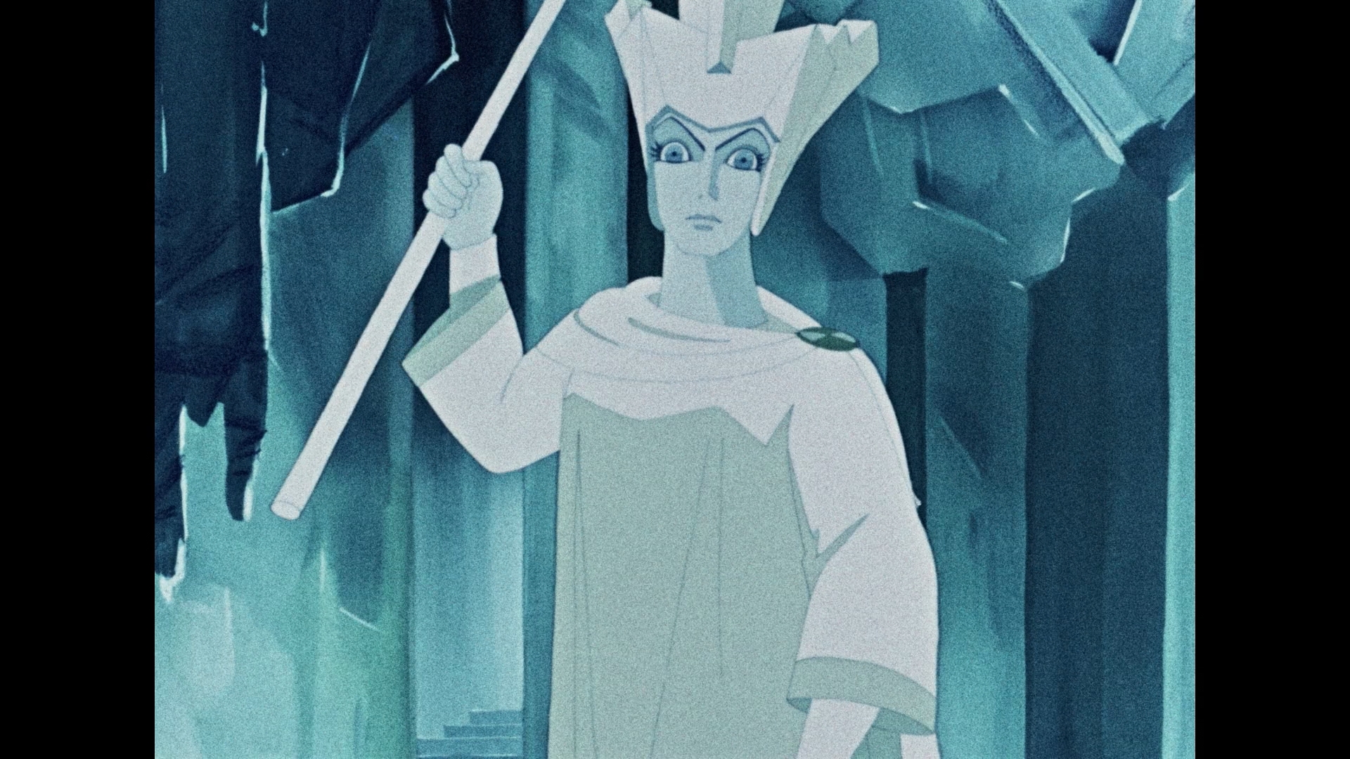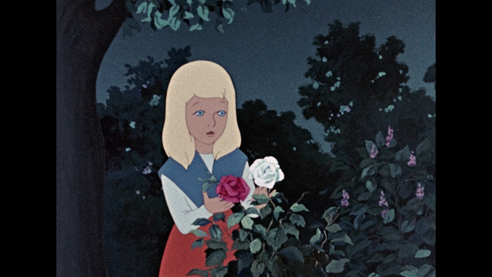 Volume two shifts gears to pure fantasy with the films of Lev Atamanov including his legendary The Snow Queen, a familiar title among animation fans as the favorite of Hiyao Miyazaki and one that inspired him to keep going in his chosen career. The film is one of the earliest adaptations of the famous Hans Christian Andersen, which was later redone many times and served as the inspiration for Frozen before undergoing a major script overhaul. In the works for two years, the film earned some of the widest international distribution for a Soviet animated film and was usually dubbed with high-profile voice artists from each region (with Sandra Dee and Tommy Kirk recruited for the heavily reworked U.S. version, later redone for home video with Kathleen Turner and others). In this version, a little old elf tells the story of Kai and Gerda, inseparable children who like to pass time growing roses. In the dead of winter, Gerda's grandmother tells them about the Snow Queen, provoking Kai to make a nasty remark that angers the mystical ruler. She puts a spell on the boy via two ice shards and takes him to her ice palace, with Gerda in pursuit and gaining